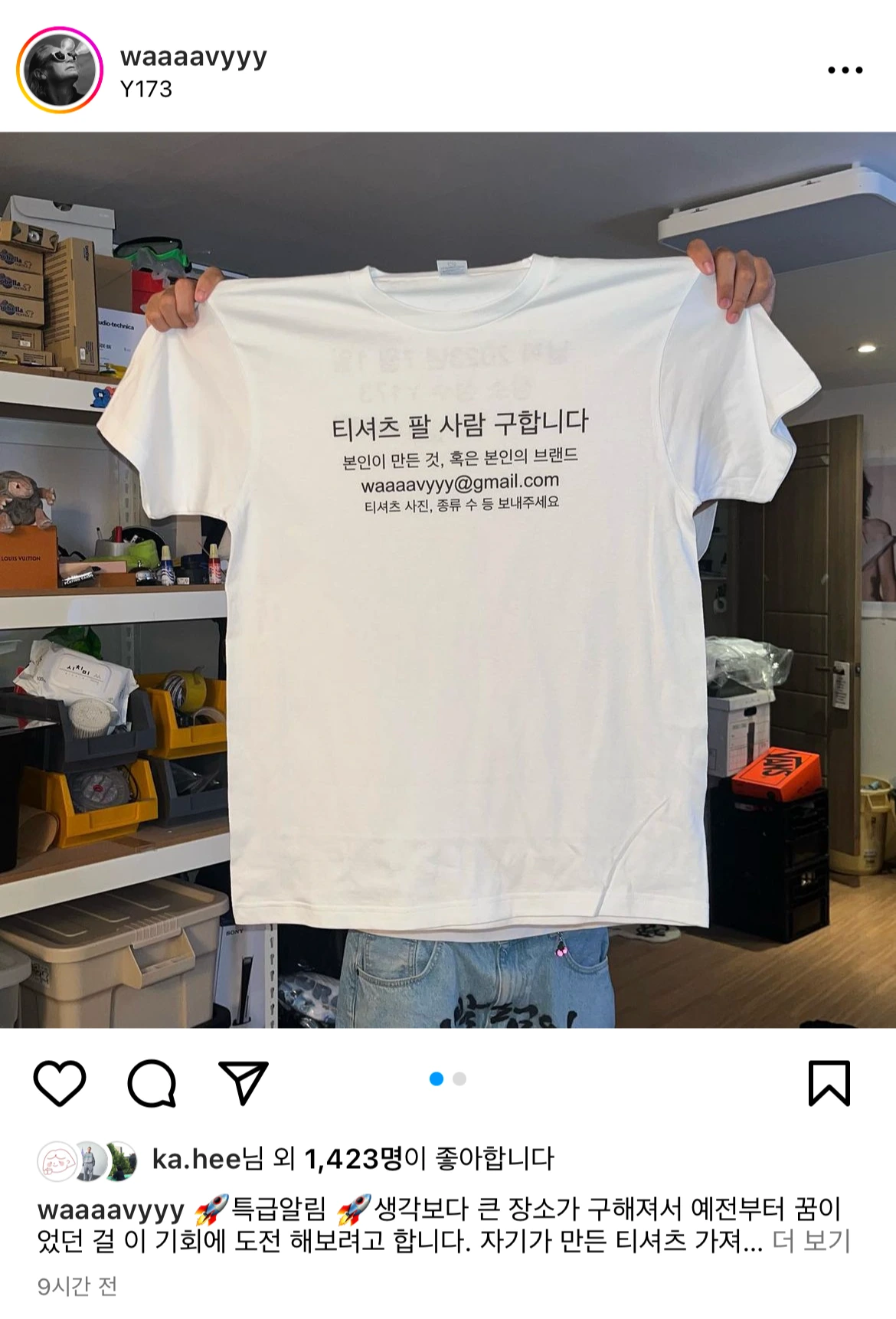 김씨네 과일 대표 김도영 님의 인스타그램에 올라온 티셔츠 플리마켓 셀러 모집 콘텐츠. 티셔츠 셀러를 모집하는 만큼 모집 안내문도 티셔츠로 뽑았다. 메시지와 이미지가 완벽하게 일치하는 좋은 사례!
