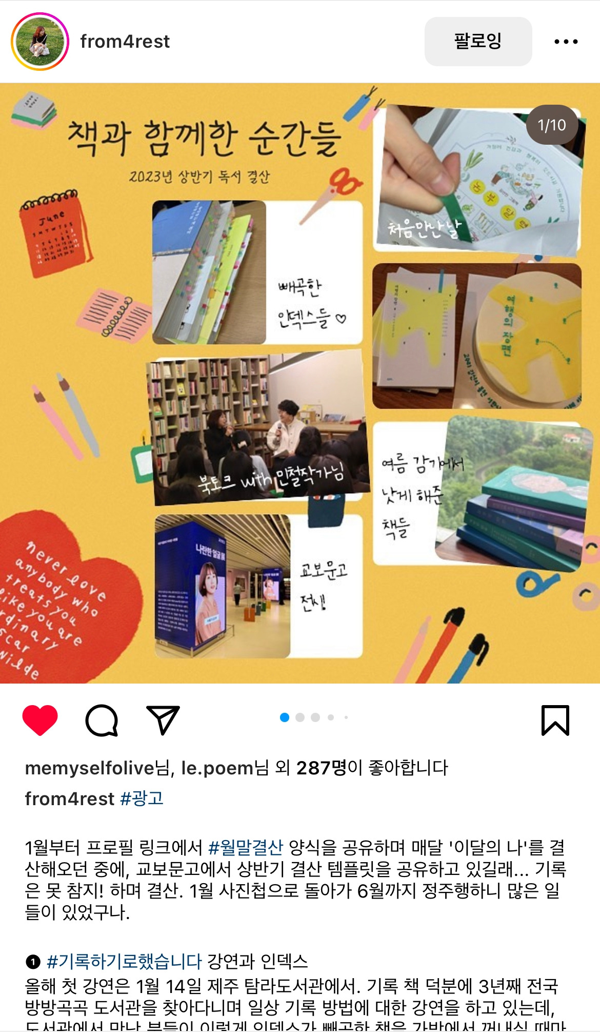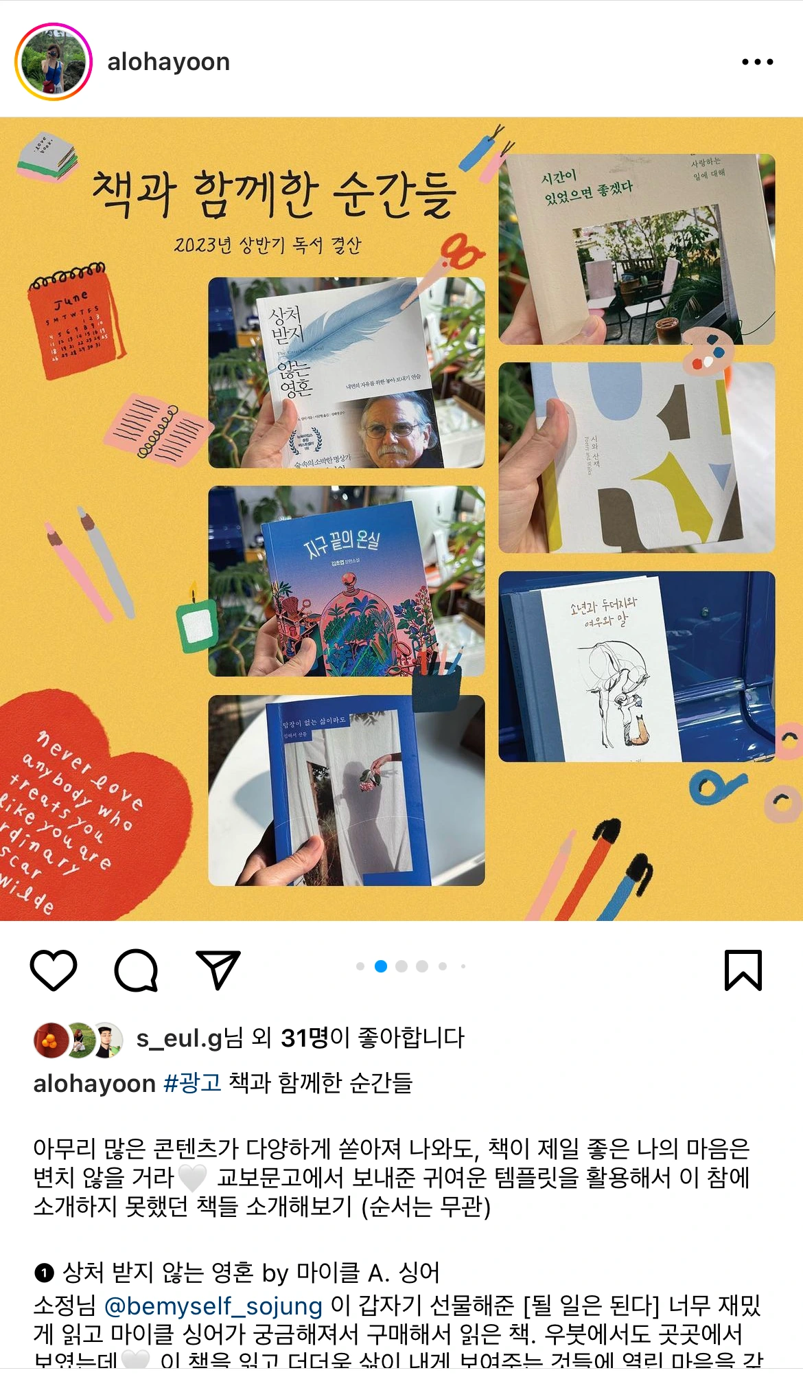 이 이벤트는 프리랜서 마케터 융(@alohayoon)과 김신지 작가(@from4rest) 피드에서 광고 게시물로 발견했는데, 융님은 상반기에 읽고 좋았던 책 리스트를 김신지님은 작가님의 책과 관련한 이야기를 공유했다. 그리고 해시태그를 타고 가면 북 인플루언서나 작가님들의 추천 책 리스트도 볼 수 있는데 어느 순간 이 템플릿을 올린 사람들의 게시글을 빠짐없이 읽어보고 그중 보고 싶은 책의 이름을 열심히 메모하는 나를 발견했다.