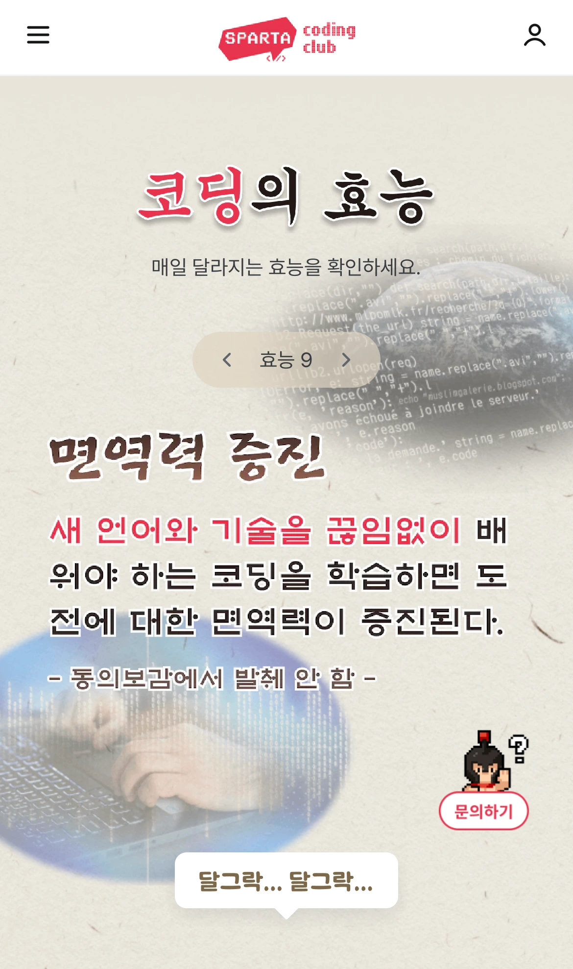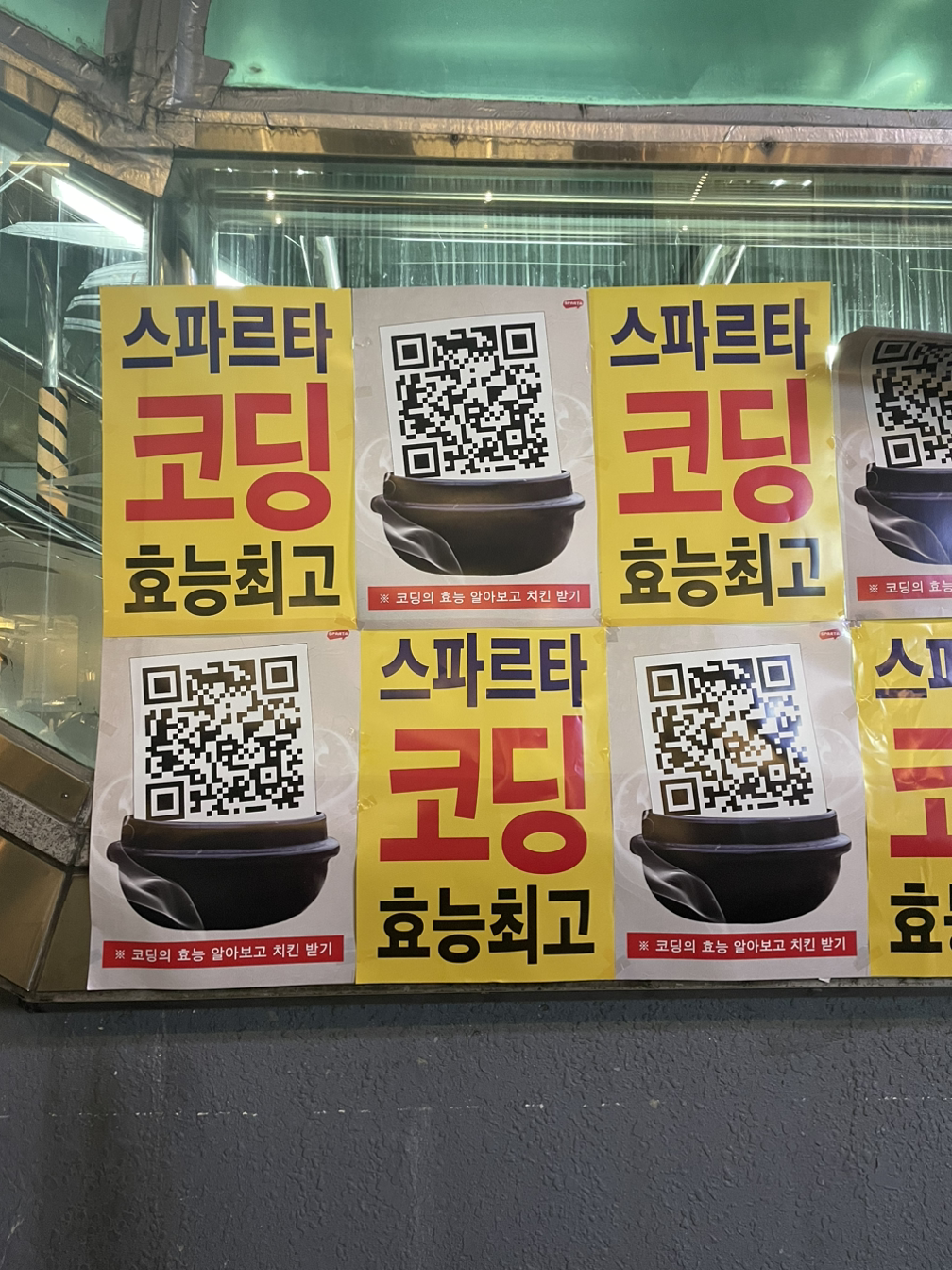 성수역을 지나가는데 눈이 현란해 옆을 보니 전단지가 덕지덕지 붙어있었다. 강렬한 노란색 배경에 전단지를 가득 채운 큰 글씨, 강조를 위한 빨간색까지, 건강식품이나 즙 광고 같았는데 자세히 보니 코딩이다. 스파르타코딩클럽을 이미 알고 있지만 뚝배기에 담겨있는 QR을 외면할 수 없어서 링크를 열어보았다. 그랬더니 오리로스 집에 붙어있을 것 같은 코딩의 효능 이미지가 뜬다.