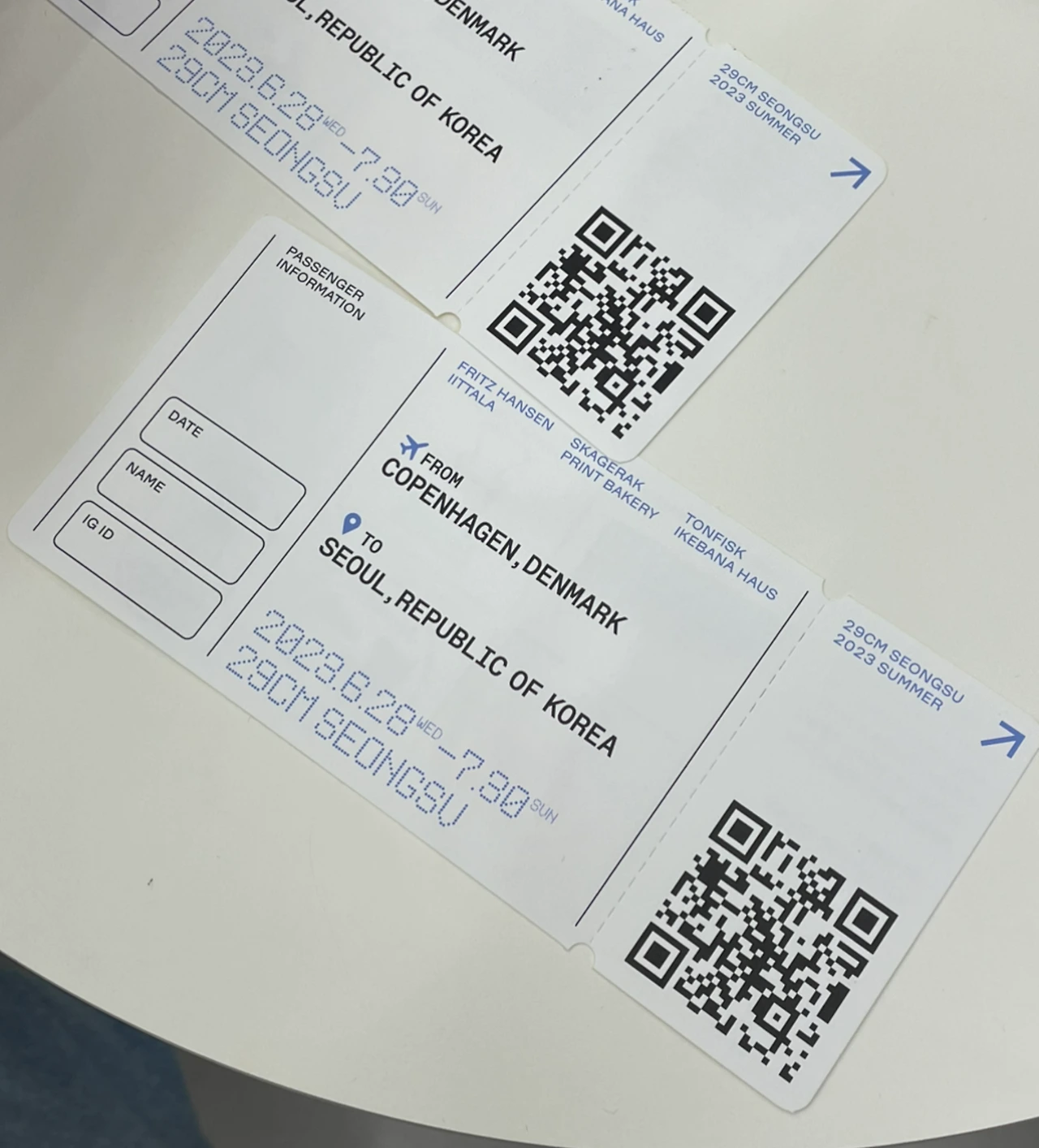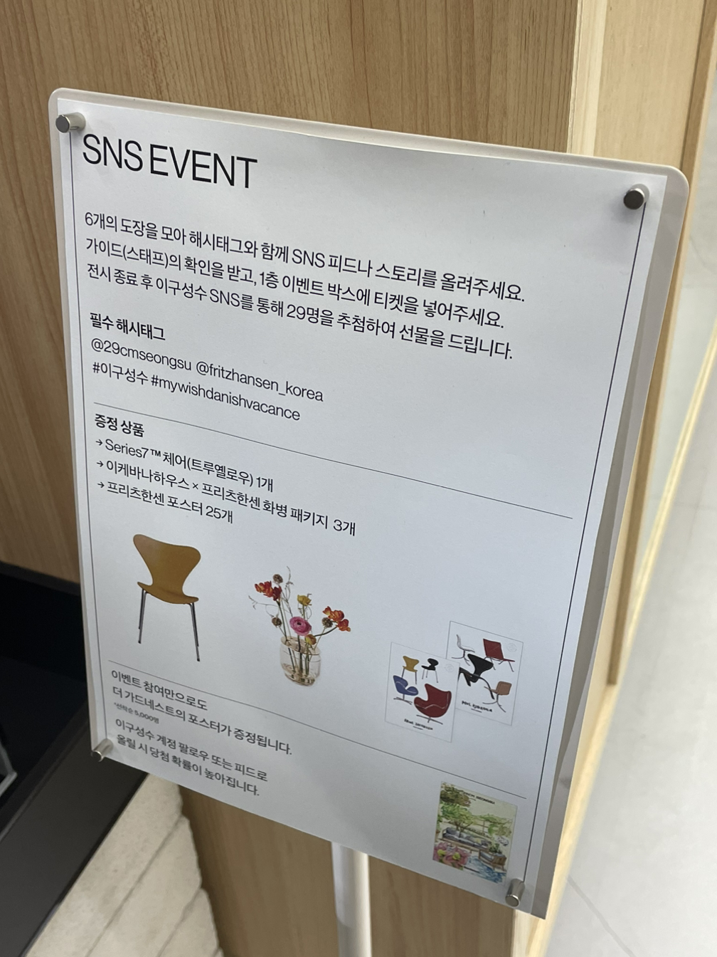 이구성수에서 하는 프리츠 한센 팝업을 보러 갔다가 발견한 포인트들. ❶ SNS 이벤트를 하는데 당첨자를 29명 뽑는다. ❷ SNS 이벤트를 하려고 보니 적어야 하는 해시태그가 정말 많았다. 할 마음이 사라져 앱을 끄려고 하고 있는데, 직원분이 QR을 인식하면 전체 해시태그를 복사할 수 있다는 꿀정보를 알려주셨다. 응모함 앞에 있는 커다란 화면에서, 이벤트 참여 종이에서 QR을 발견할 수 있었다. 실제로 QR을 인식하니 구글 검색 화면으로 넘어갔는데, 검색 창에 사용해야 하는 해시태그가 적혀 있었고 간편하게 [전체 선택] - [복사]해서 이벤트에 참여할 수 있었다.