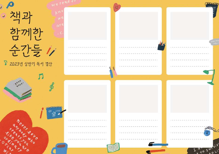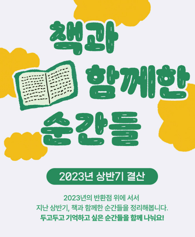교보문고가 2023년 상반기 결산을 #책과함께한순간들 이벤트를 진행하고 있다. 올해 상반기에 책과 함께한 순간들을 자유롭게 작성할 수 있는 템플릿을 수수진 일러스트레이터(@_soosoojin)와 협업해 만들었고, 이 템플릿을 다운로드해 자유롭게 채워 SNS에 공유하면 되는 방식의 이벤트다.