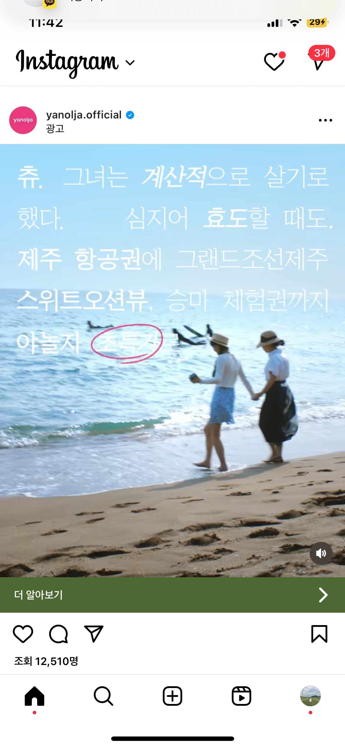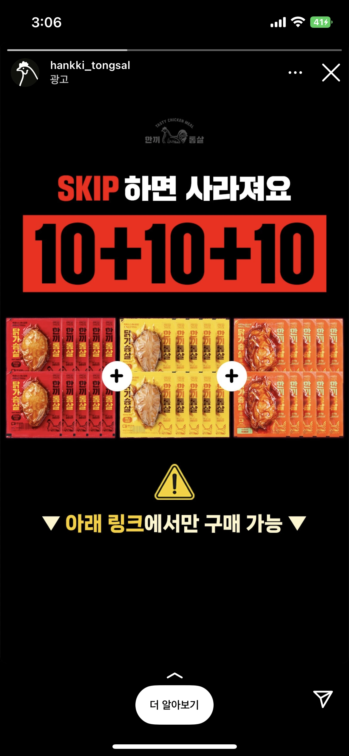 인스타그램에 너무 많은 스토리 광고. 포맷도 이야기도 다들 비슷비슷해서 넘기고는 하는데 한끼통살은 가장 상단에 잘 보이게 'SKIP 하면 사라져요'라는 카피로 당장 사야 할 것 같은 느낌을, '아래 링크에서만 구매 가능'으로 CTA 버튼을 클릭하게 했다. 당연히 꼭 이 링크로 들어가지 않아도 싸게 살 수 있는지 아는데도 불구하고 눈에 잘 보이게 카피를 박아 넣으니 두려움이 생겼던 순간이었다.