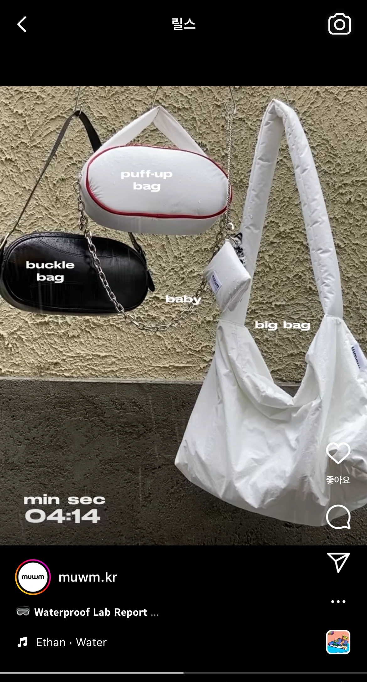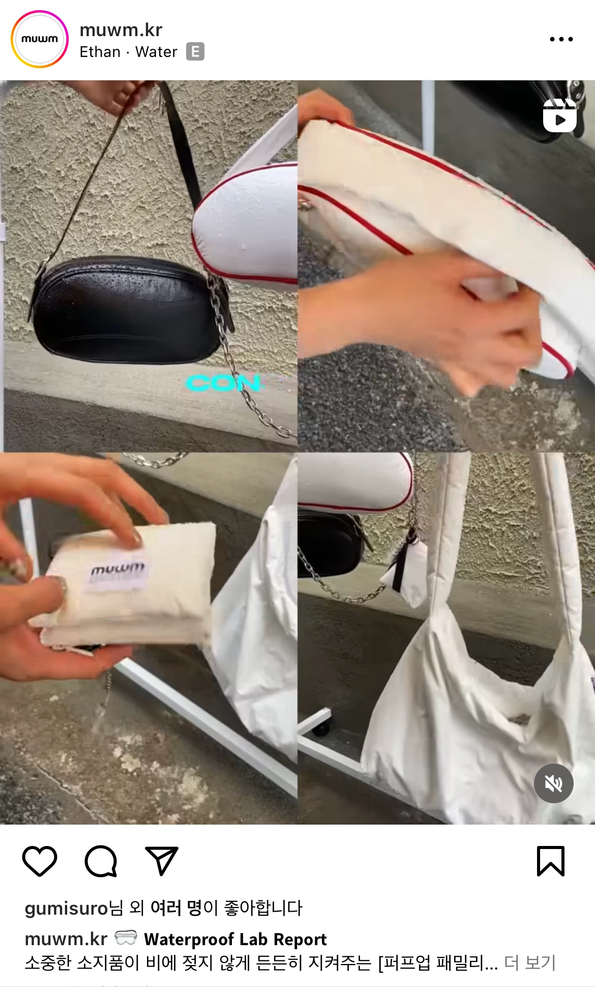 가방 역시 비에 취약한 물건 중 하나다. 무음은 정확한 타이밍에 가방 제품들의 방수 내구성을 보여주는 콘텐츠를 만들었다. 비가 오는 날, 가방 안에 물에 특히 취약한 얇은 종이를 잔뜩 집어넣고 바깥에서 7분 동안 비를 맞아 보는 실험 콘텐츠다. 7분 동안 주룩주룩 내리는 비를 맞아도 안에 있는 종이가 멀쩡한 가방을 크기별/모양별로 보고 있자니, 이번 여름 네 개 가방 중 어떤 가방이 데일리백으로 좋을지 고민하고 있는 내가 있었다.