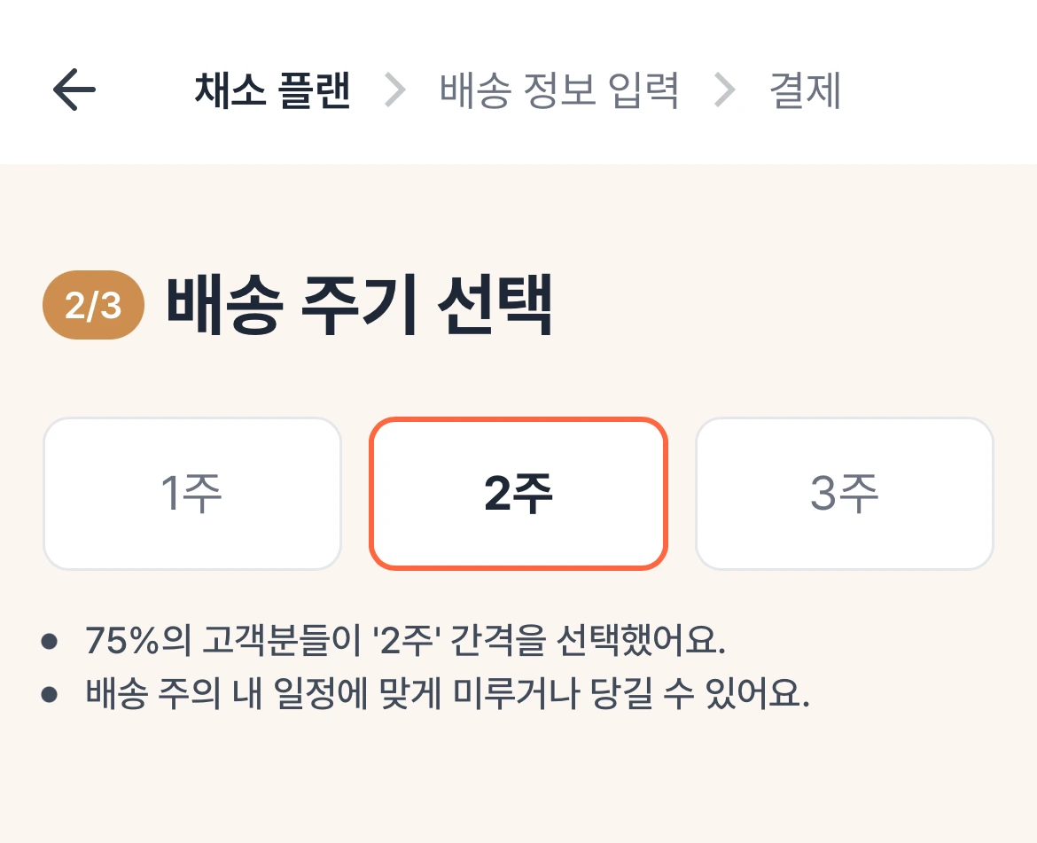 채소 구독 서비스 어글리어스 재구독을 시작했다. 전에는 배송 주기 선택에 실패해 구독을 멈췄었는데, 이번에는 배송 주기 선택에 친절한 주석이 달려있었다. '2주'를 디폴트로 체크되게 하고, 75%의 고객이 선택했다는 사실을 알린다. 또한, 내가 선택할 수 있는 범위가 1주에서 3주라는 점을 보여주니 내가 선택할 수 있는 선택지가 다양하다고 느꼈고 내 일정에 맞게 미루거나 당길 수 있다는 점을 알려주니 선택에 대한 부담이 덜어졌다.