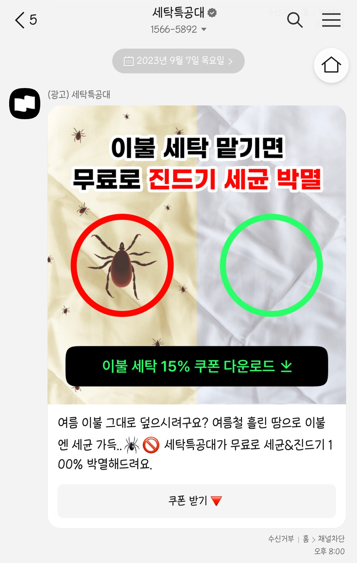 메시지를 보낸 타이밍도 딱 좋다. 여름이 끝나고 계절이 바뀌고 있는 가을 초입에 보냈다. 부지런한 사람이 아니라면 '이불 빨래를 해야지'하고 마음만 먹고 있을 시점에 말이다. CRM 메시지에 중요한 건, 타이밍과 메시지를 클릭하게끔 하는 헤드 카피, 그리고 클릭할 수 있는 명분이라고 생각하는데 그 세 가지 요소가 모두 완벽한 메시지라고 생각한다.