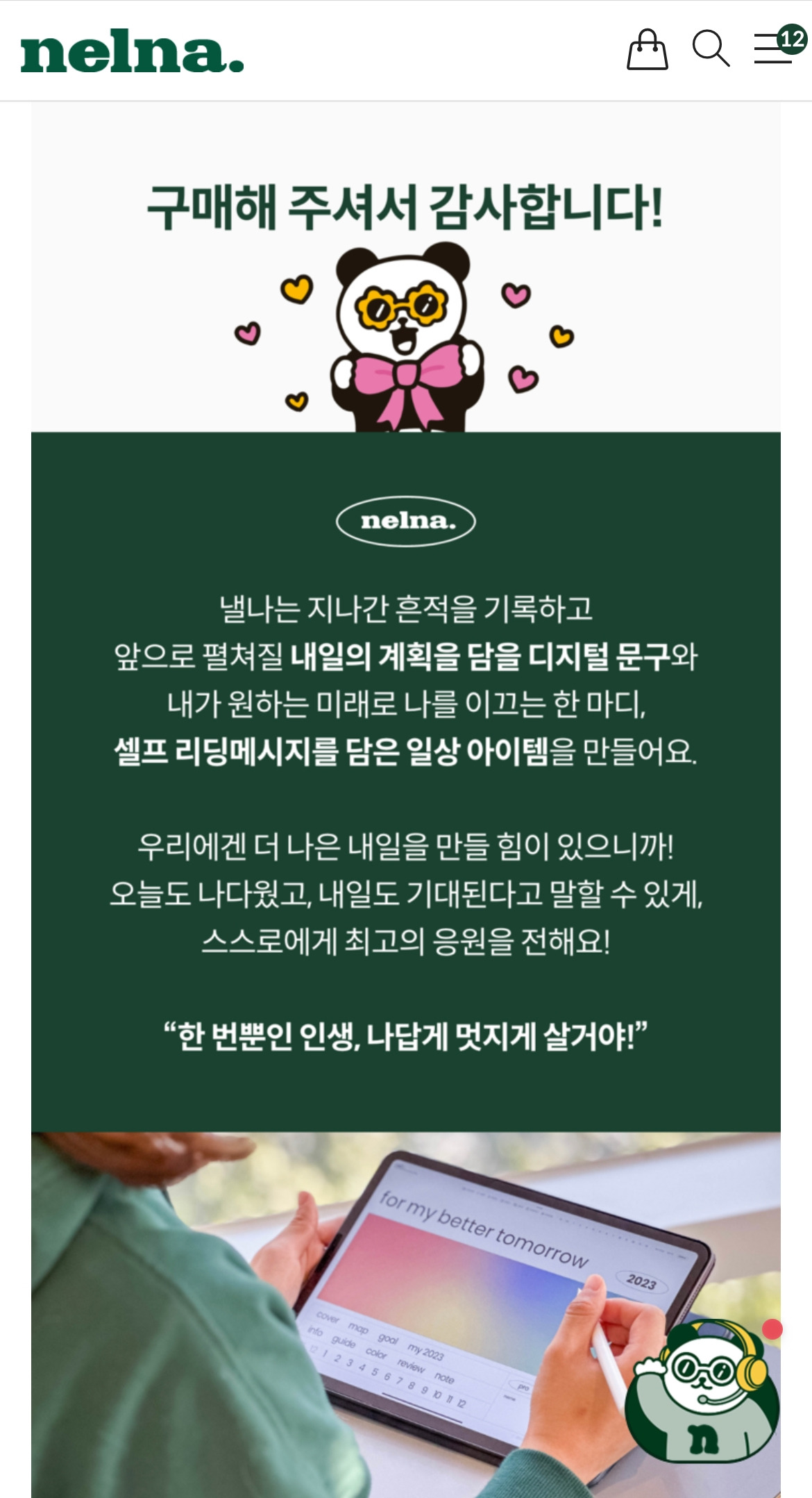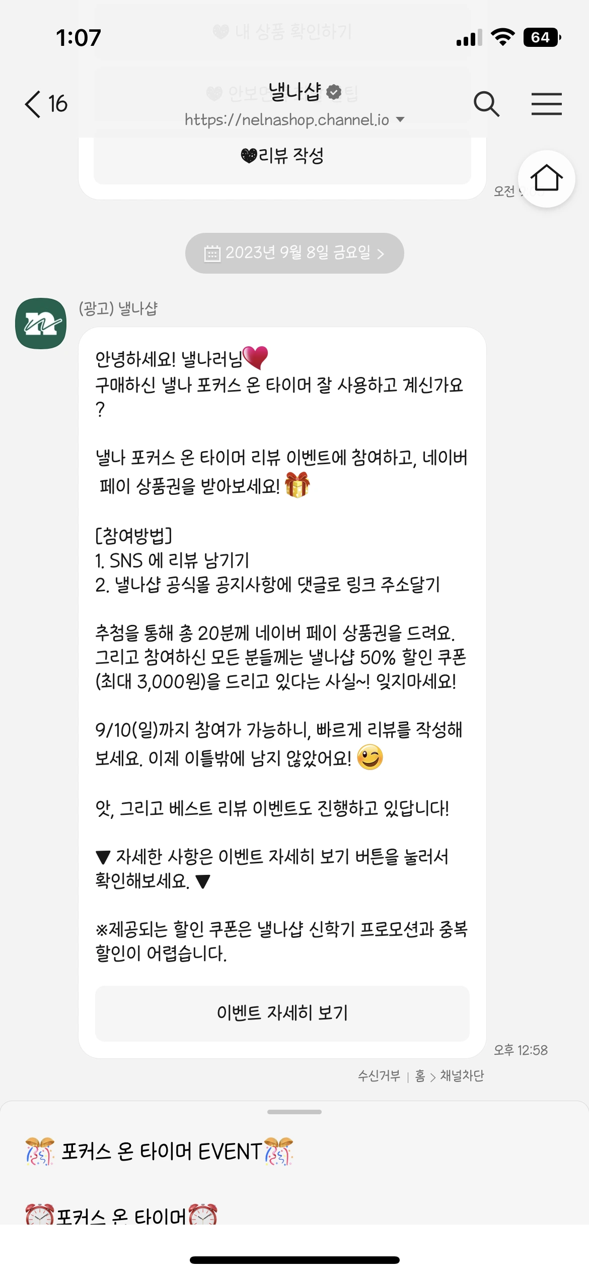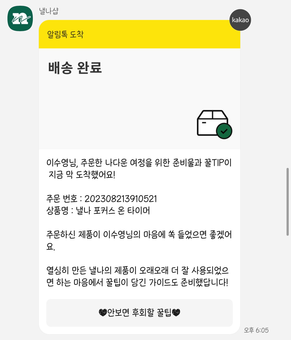 디지털 문방구 낼나에서 포모도로 타이머(포커스 타이머)를 구매했는데, 사용 방법이 간단한 타이머임에도 불구하고 배송 완료 후 사용 꿀팁을 함께 전달했다. 꿀팁을 누르면 ‘구매해 주셔서 감사합니다’라는 문구가 먼저 뜨면서 낼나의 브랜드 스토리를 설명하고, 타이머의 사용 방법을 확인할 수 있다. 또한, 구매하고 좀 지나니 리뷰 이벤트를 참여하라는 메시지도 왔다.