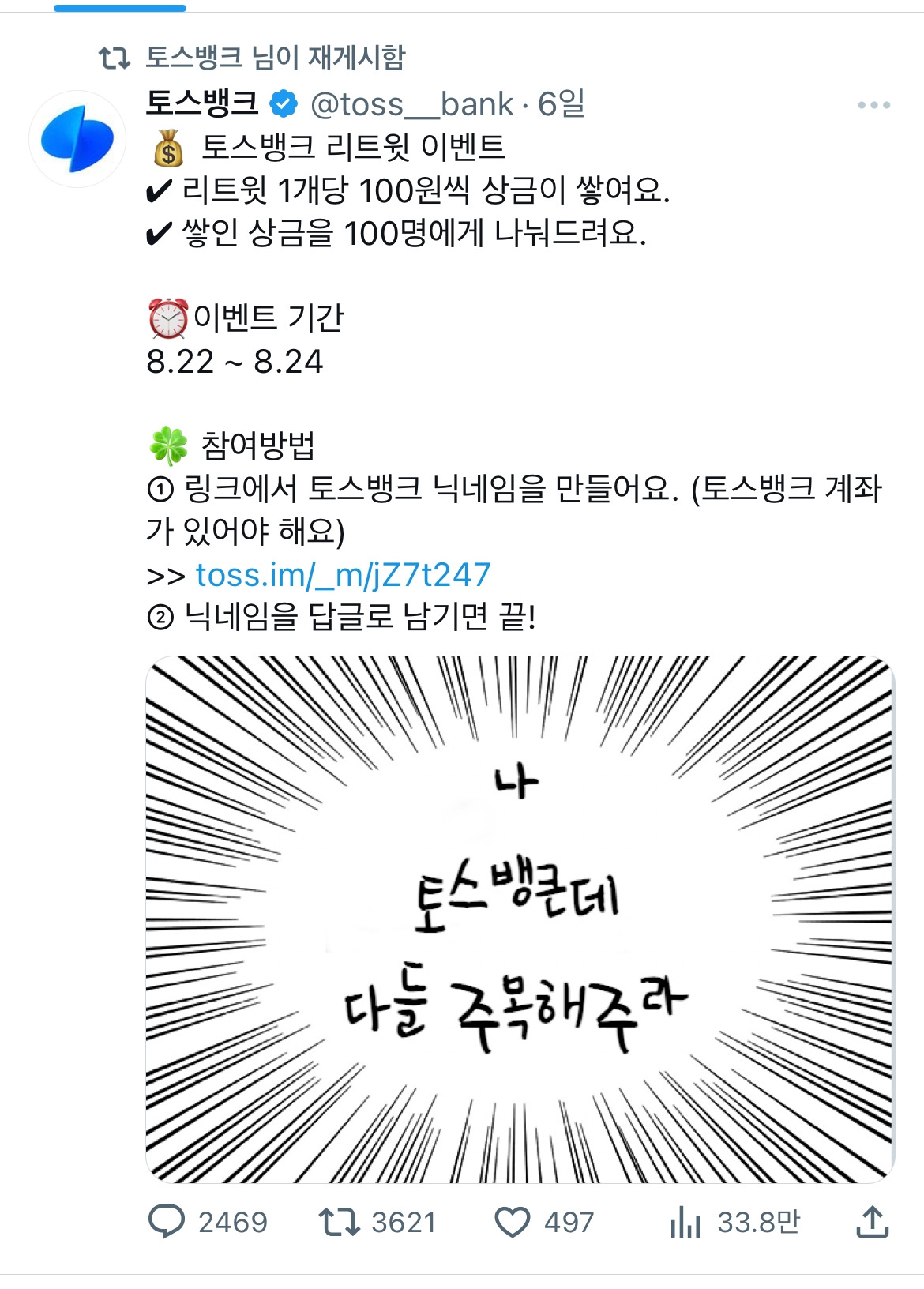 트위터 문법에 맞는 토스뱅크의 이벤트. 게시물을 리트윗 하고, 게시글 링크에 들어가 토스뱅크에서 닉네임을 만든 후 답글로 닉네임만 작성하면 참여할 수 있는 간단한 이벤트다. 트위터 고유의 기능인 ‘리트윗’과 ‘답글’을 활용한 이벤트라 크게 트위터 피드 안에서 벗어나 보이지 않고, 리트윗과 답글을 쌓아 계속해서 게시글의 노출을 늘리며 이벤트를 알릴 수 있는 효과도 만든다. 만약, 토스뱅크의 계좌가 없었던 사람이라면 참여하기 쉬운 이 이벤트를 통해 계좌를 개설할 가능성이 높아 보인다.