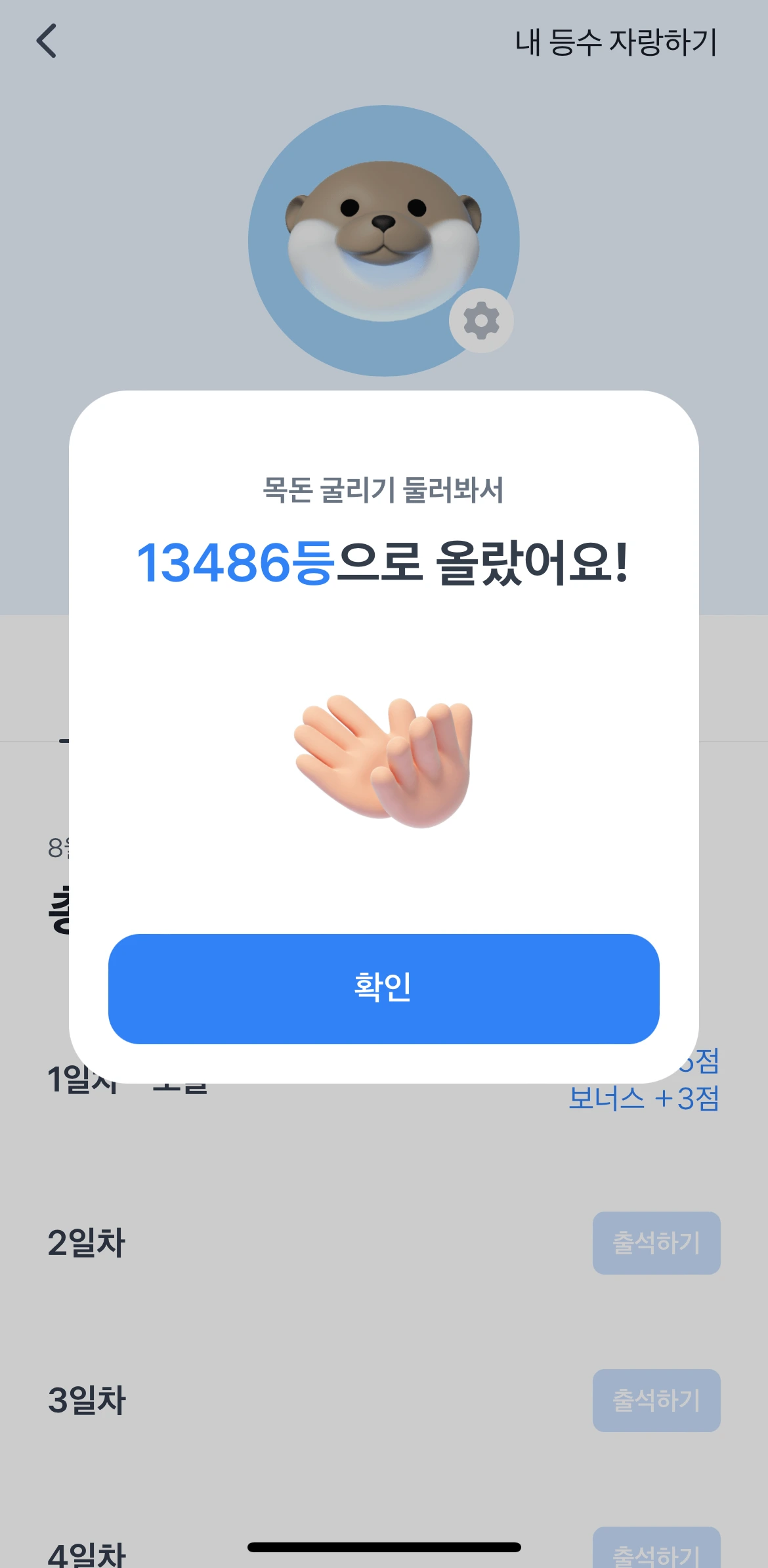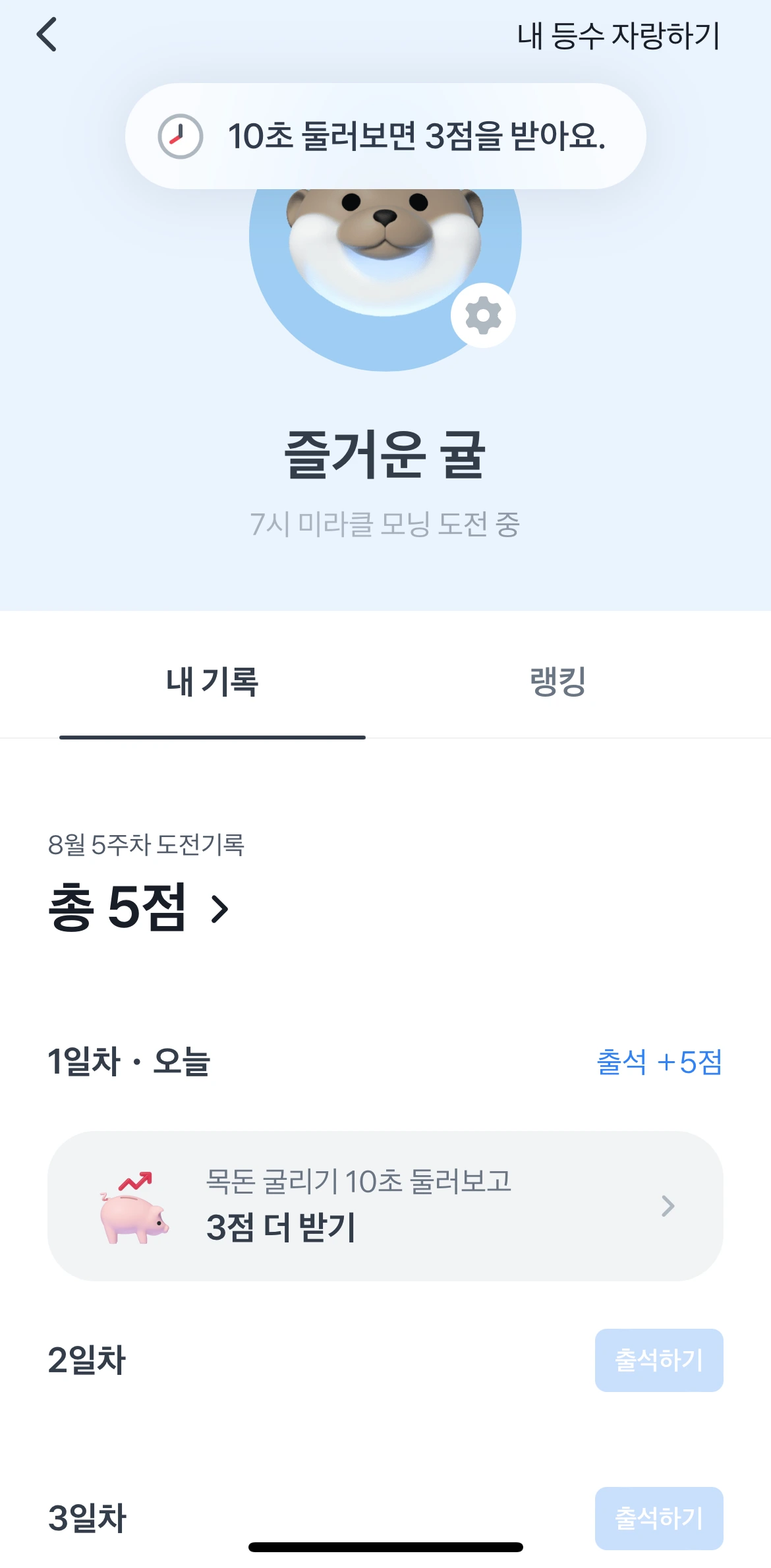전에 카카오뱅크에서 미라클모닝 챌린지를 한 적이 있는데 토스에서도 진행하길래 한 번 도전해 보았다. 카카오뱅크는 매일 참여하면 상금이나 선물을 받을 수 있고, 토스는 성공할 때마다 점수가 쌓이고 등수 경쟁을 하는 시스템이다.