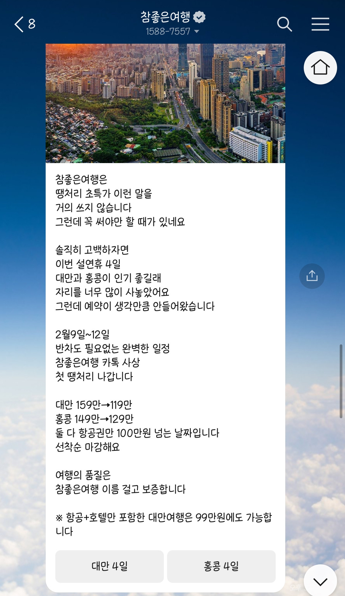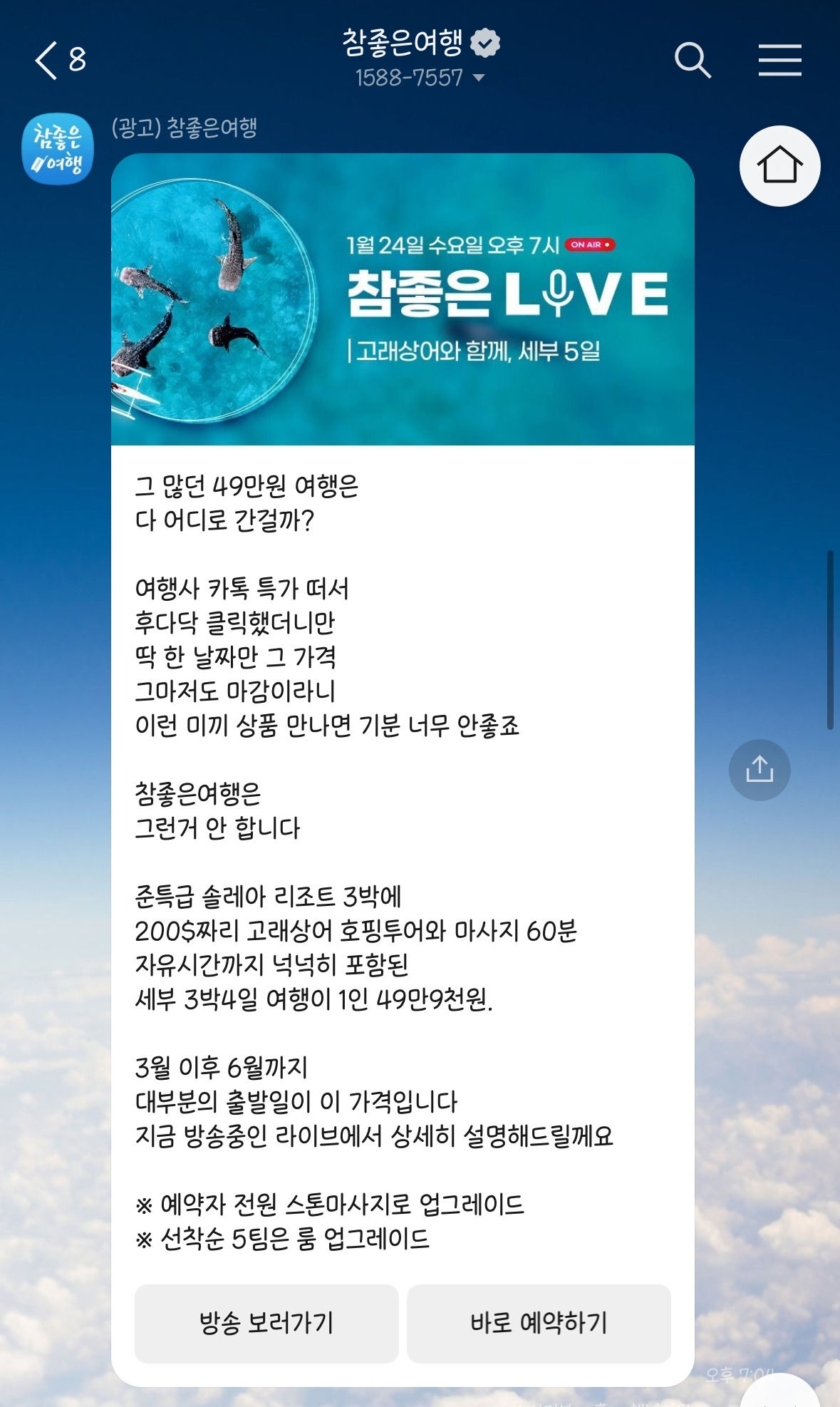 그리고 솔직하게 다가간다. 초특가 여행 상품을 판매하는 이유가 수량 예측을 잘못한 실수라는 점, 참좋은여행은 다른 여행사의 49만 원 미끼 상품처럼 판매하지 않는다는 점, 북극 상품을 팔게 된 상황을 진솔하게 전한다. 긴데도 자꾸 읽게 되는 매력이 있다. 패키지여행을 선호하지 않는데도 구미가 당긴다. 부모님 여행을 보내드려야 한다면 이렇게 진심으로 일하고 있는 여행사가 좋지 않을까? 상상을 해보기도 한다. 한 번 카카오톡 플친 중 (마케터이자) 고객으로서 필요 없는 채널을 한 번 정리한 적 있는데 참좋은여행은 고민조차 하지 않고 계속 글을 받아보고 싶은 채널로 남았다.