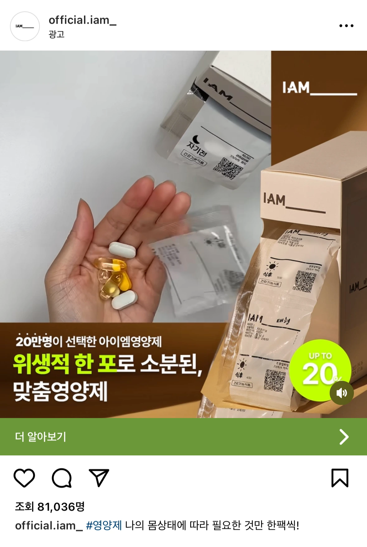 먼저 아이엠 광고는 왼쪽 상단에 있는 부분이 영상으로, 오른쪽에는 제품의 전체샷이, 하단에는 아이엠이 어떤 서비스인지 계속해서 보이게 했다. 영상에는 누군가가 영양제 한 포를 뜯어서 먹는 장면인데 이것만 봐서는 어떤 서비스인지 인지하기 어렵지만, 함께 있는 광고카피와 이미지 덕분에 이해를 할 수 있다.