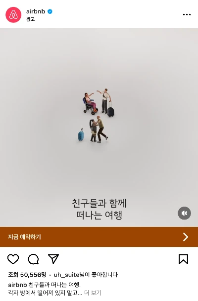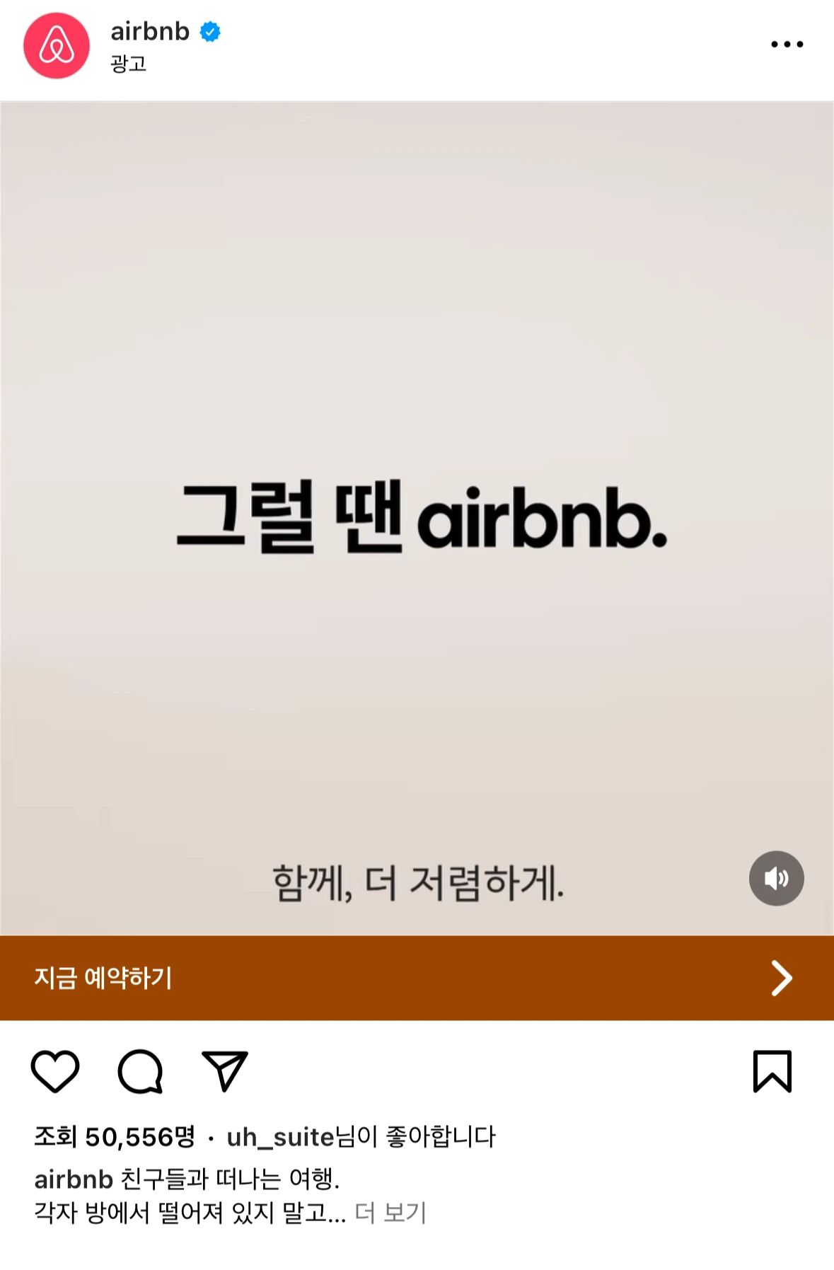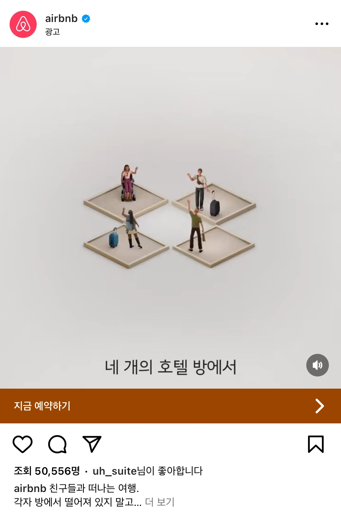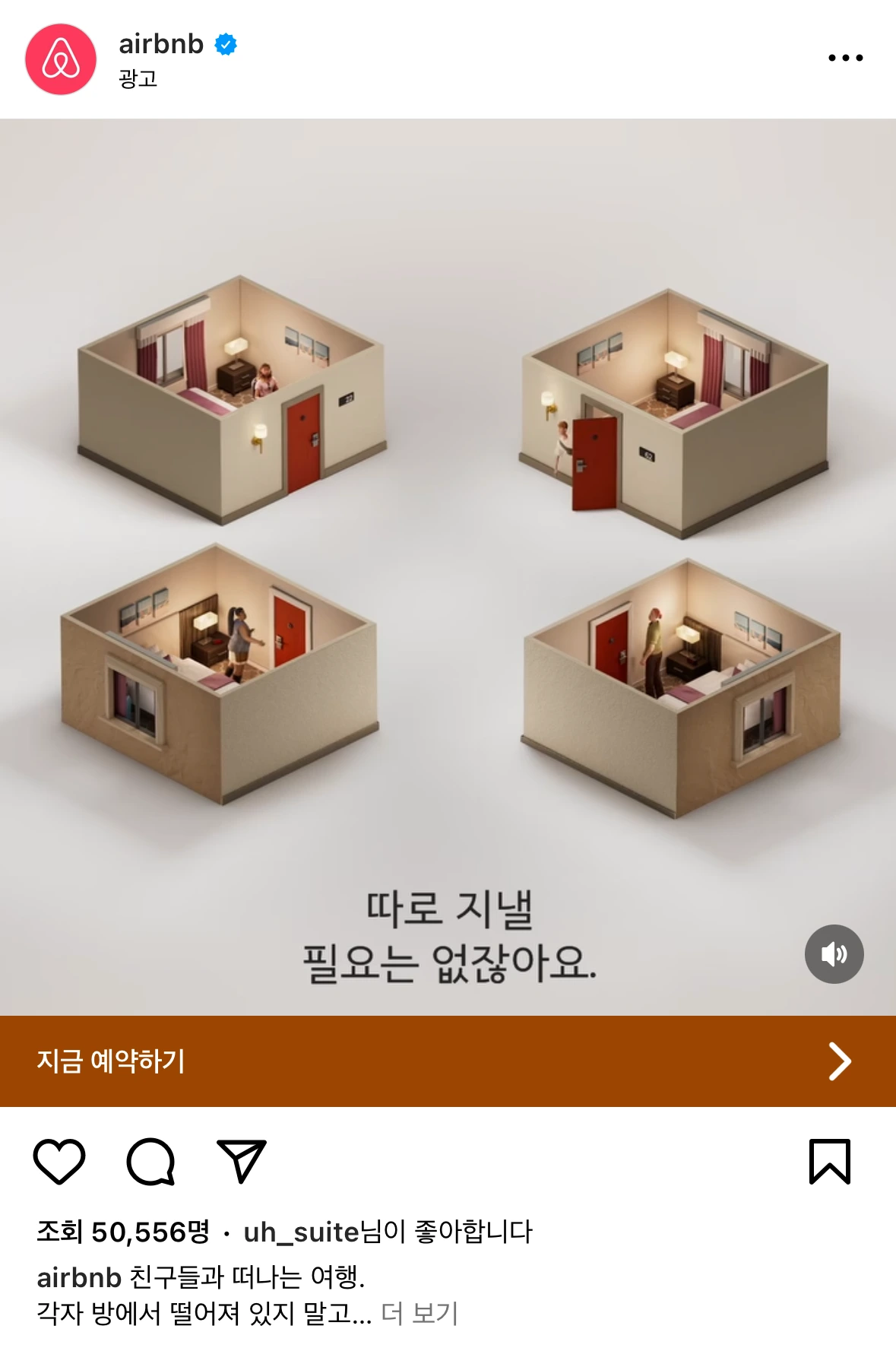 에어비앤비의 인스타그램 광고. 광고의 메시지는 간결하다. '친구들과 함께 떠나는 여행, 네 개의 호텔 방에서 따로 지낼 필요는 없잖아요. 그럴 땐 에어비앤비. 함께, 더 저렴하게.' 호텔과 에어비앤비가 가장 차별회될 수 있는 두 가지 포인트, '한 지붕에 같이, 그리고 더 저렴하게'라는 소구 포인트를 부연 설명 없이 깔끔하게 담아내면서도 감도 있는 3D 그래픽으로 시선도 잡았다. 단 5줄의 자막으로도 충분히 브랜드에서 말하고자 하는 메시지가 와닿았던 광고다.