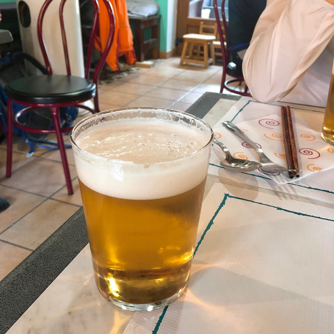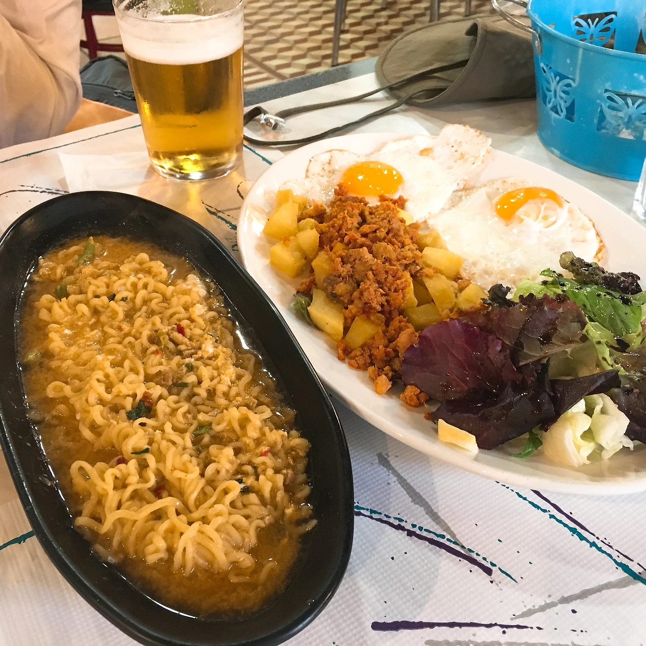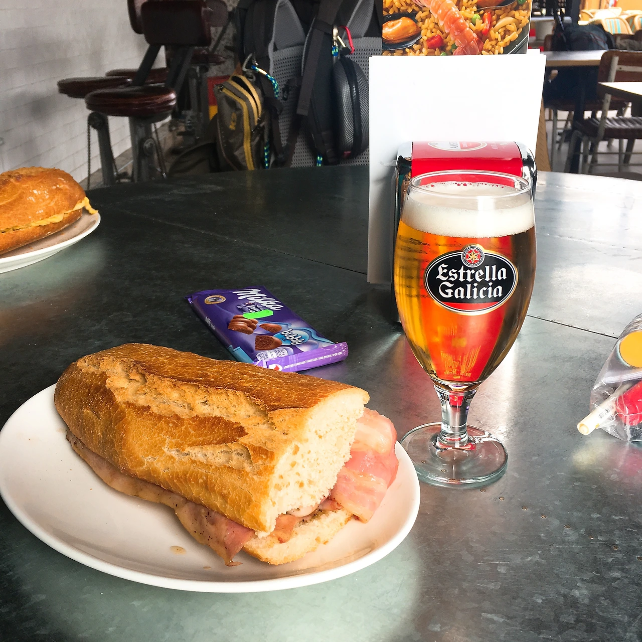 한국 산티아고 네이버 카페에서 유명한 식당이 하나 있다. 바로 한국 '봉지 라면'을 직접 끓여주며 햇반까지 함께 맛볼 수 있는 곳이다. 아침을 먹은 지 얼마 되지는 않았지만 라면을 직접 끓여주는 곳을 지나칠 수는 없었다. 가게 앞에 도착하니 입간판에 반가운 한글로 '라면, 밥'이라는 메뉴가 쓰여있었다. 냉큼 들어가서 라면과 햇반과 맥주를 시켰다.
