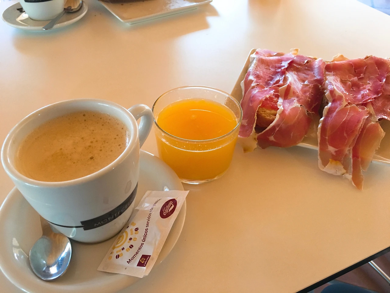 어젯밤에는 다리가 저려올 정도로 아파 오늘 걷지 못할 거라고 생각했는데 일어나니 멀쩡했다. 유난히 말짱한 정신으로 시작하는 아침이다. 브루스케타(bruschetta)를 파는 바를 만나 하몽과 토마토 맛이 가득한 신선한 아침을 먹었다. 하몽 위에 뿌려진 올리브유는 왜 이리 맛있고, 조각나 있는 토마토도 왜 이렇게 맛있는지. 한국에 들어갈 때 뭐든 사가고 싶은 마음이다. 오늘도 카페 콘 레체(카페라테)와 오렌지 착즙 주스는 빼먹지 않고 꼭꼭 마셨다.