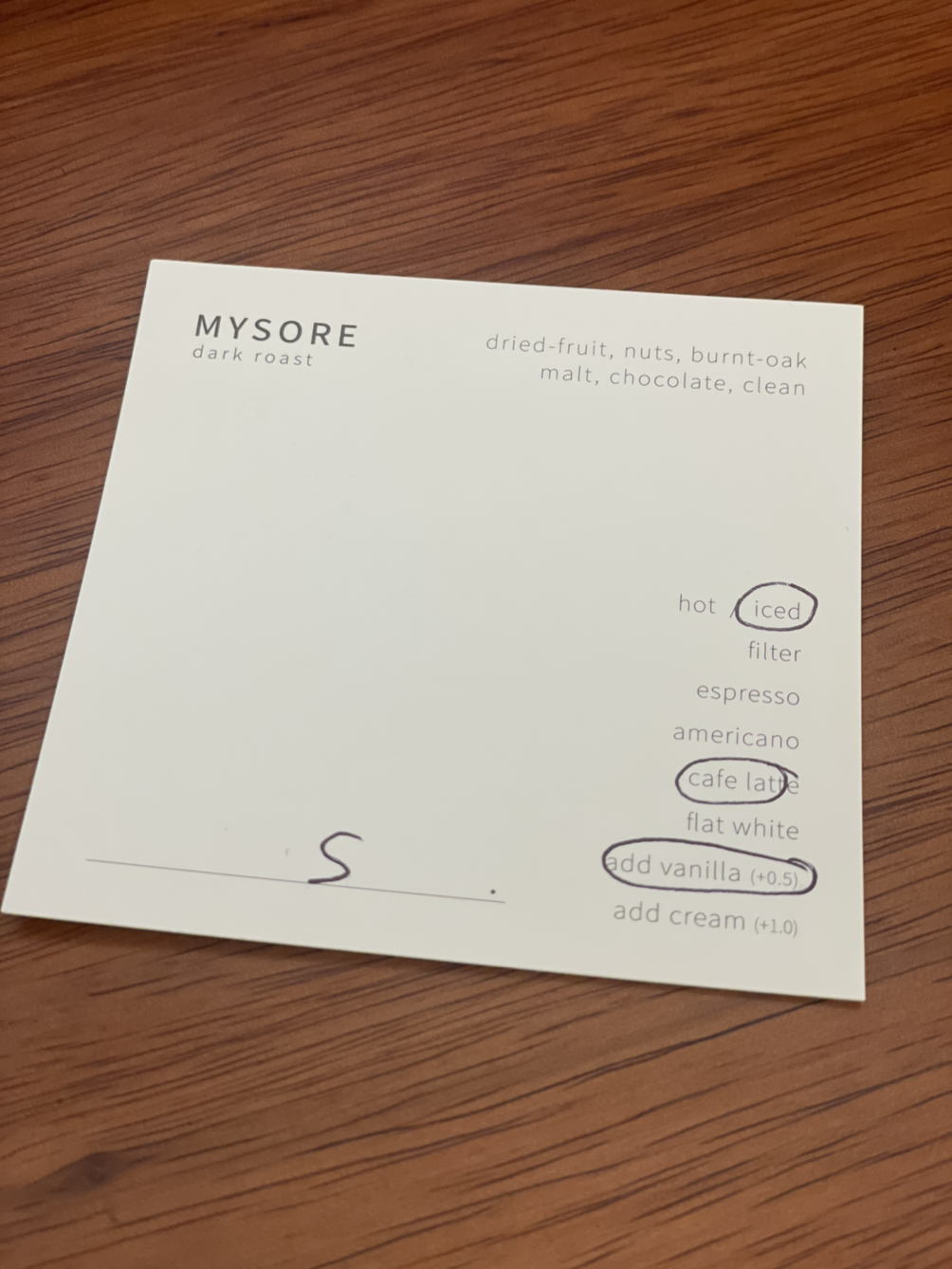 가장 좋아하는 포인트는 꽤 생경한 커피 주문 방식이다. 이곳에서는 꼭 커피 주문 카드를 작성해야 하는데, 원두를 먼저 고르고 어떤 방식으로 추출할 건지(필터/머신), 우유를 넣는다면 얼마큼 넣을 건지, 곁들일 것(크림 혹은 바닐라 등)이 있는지를 순차적으로 체크하게 된다. 평소 같으면 '아이스 라떼 하나요' 하며 간단하게 생각했을 테지만 커피 주문 카드를 받아 들고 나면 오늘 내가 어떤 커피를 먹고 싶은지 고심하고 집중하게 된다.
