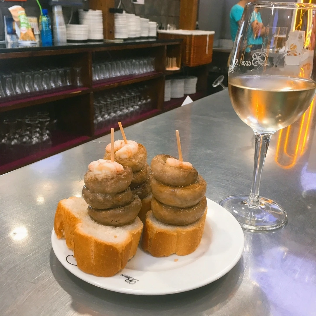그 다음부터는 거의 가게 10분 컷이었다. 들어온 지 10분도 되지 않아 와인을 비우고, 다시 또 다른 가게로, 또 안주와 와인을 순삭하고 또 다른 가게로 향했다. 이 타파스 거리에 있는 모든 가게가 사랑스러워 배만 허락한다면 여기에 계속 남고 싶었다. 노란 빛이 일렁이며 흘러나오는 거리는 한껏 따뜻했다. 낯선 언어들이 와인잔 표면을 타고 둥그렇게 흘렀다. 사람들을 구경하려 몸을 돌리면 마주치는 눈이 정겨웠다. 저녁 시간의 여유를 즐기는 현지인과 여행자들의 설렘과 행복이 모두 함께하는 거리였다. 눈을 마주할 때마다 한 잔, 두 잔 함께 잔을 드는 마법같은 곳이었다.