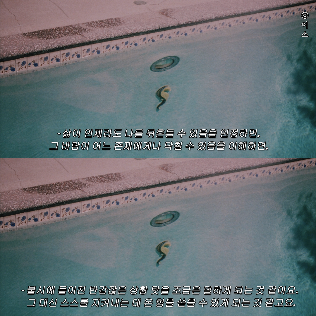 삶이 언제라도 나를 뒤흔들 수 있음을 인정하면, 그 바람이 어느 존재에게나 닥칠 수 있음을 이해하면, 불시에 들이친 반갑잖은 상황 탓을 조금은 덜하게 되는 것 같아요. 그 대신 자신을 지켜내는 데 온 힘을 쏟을 수 있게 되는 것 같고요. 우리가 삶을 다스릴 힘을 평생 얻지 못하겠지만, 나를 다스릴 힘은 언제고 기를 수 있을 테지요.