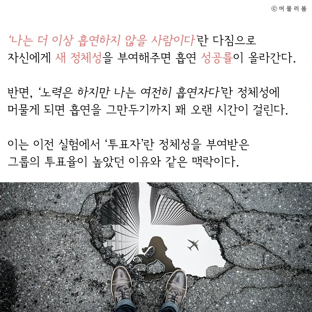 반면, ‘노력은 하지만 나는 여전히 흡연자다’란 정체성에 머물게 되면 흡연을 그만두기까지 꽤 오랜 시간이 걸린다. 이는 이전 실험에서 ‘투표자’란 정체성을 부여받은 그룹의 투표율이 높았던 이유와 같맥락이다,