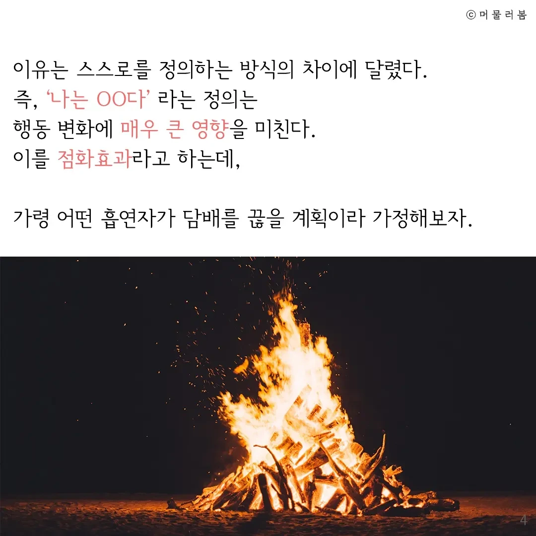 즉, ‘나는 OO다’ 라는 정의는 행동 변화에 매우 큰 영향을 미친다는 것이다. 이를 점화효과라고 하는데, 가령 어떤 흡연자가 담배를 끊을 계획이라 가정해보자.