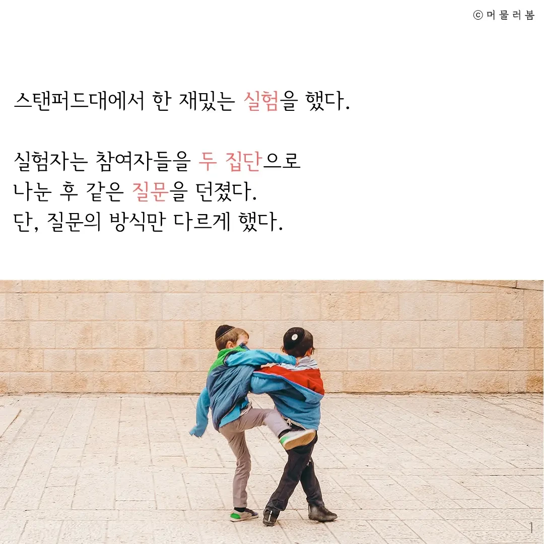 스탠퍼드대에서 한 재밌는 실험을 했다. 실험자는 참여자들을 두 집단으로 나눈 후 같은 질문을 했다. 단, 질문의 방식만 다르게 했다.