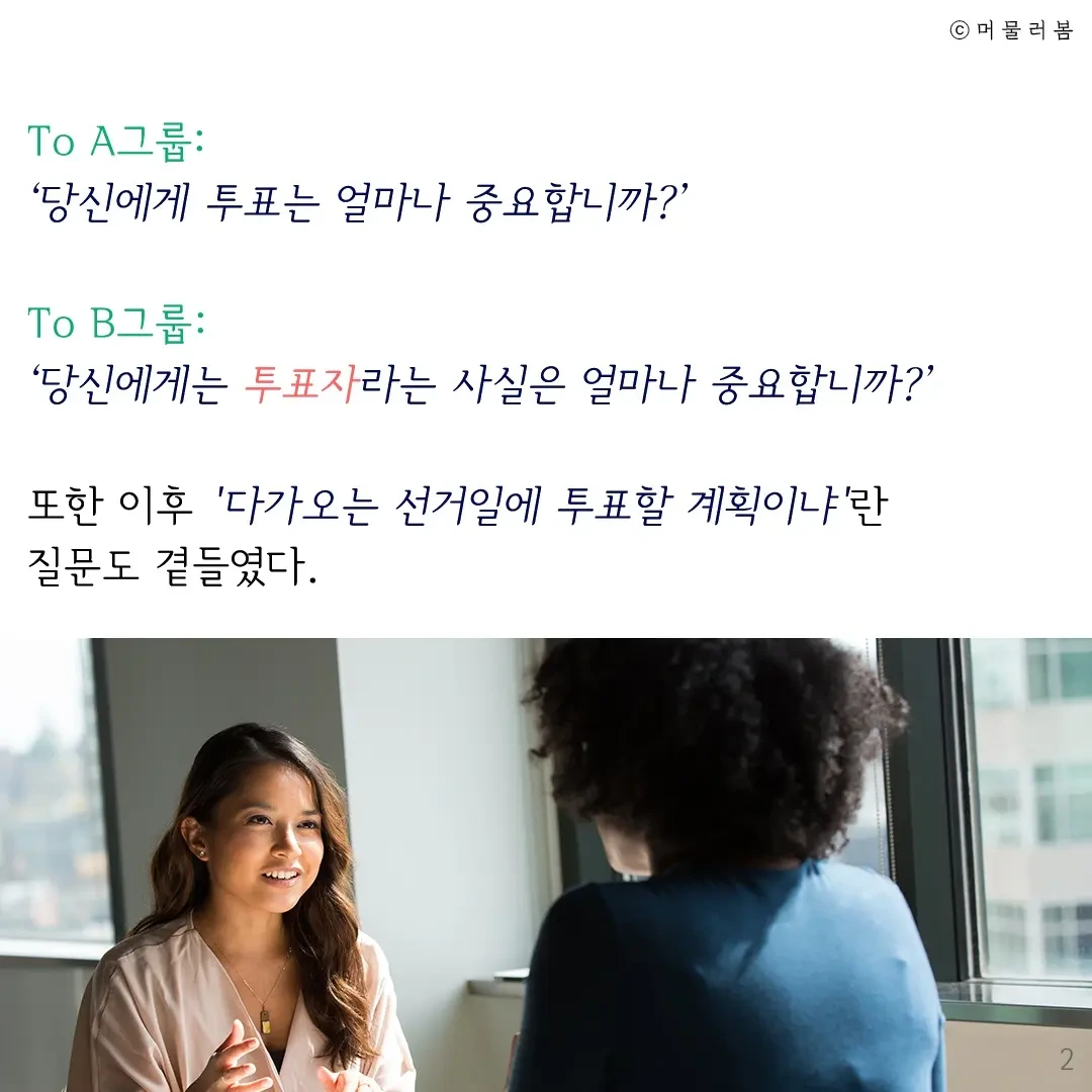 이후 선구인 명부를 통해 참여자들의 투표 여부를 확인한 결과, 단순히 투표 가능성을 질문 받은 A그룹보다 ‘투표자’와 같은 개인적 정체성 진술이 포함된 질문을 받은 B그룹의 투표율이 무려 13% 더 높았다.
