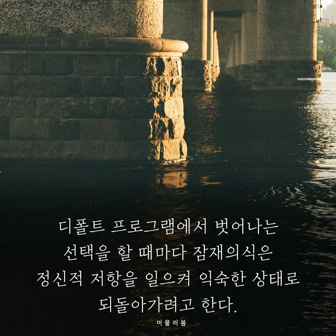 반복적으로 행하는 습관이나 행동은 잠재의식의 디폴트 모드다. 디폴트 프로그램에서 벗어나는 선택을 할 때마다 잠재의식은 정신적 저항을 일으켜 익숙한 상태로 되돌아가려고 한다.