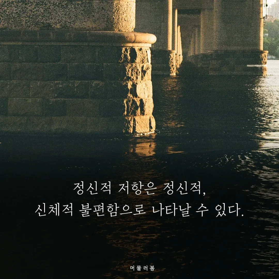 정신적 저항은 정신적, 신체적 불편함으로 나타날 수 있다. 예컨대 ‘이건 나중에 할 수 있어’, ‘이건 할 필요 없어’ 같은 주기적인 생각으로 나타날 수도 있다. 또는 동요나 불안, 단순하게는 ‘당신 자신’이 아닌 것 같은 느낌처럼 신체 증상으로 표현될 수도 있다.