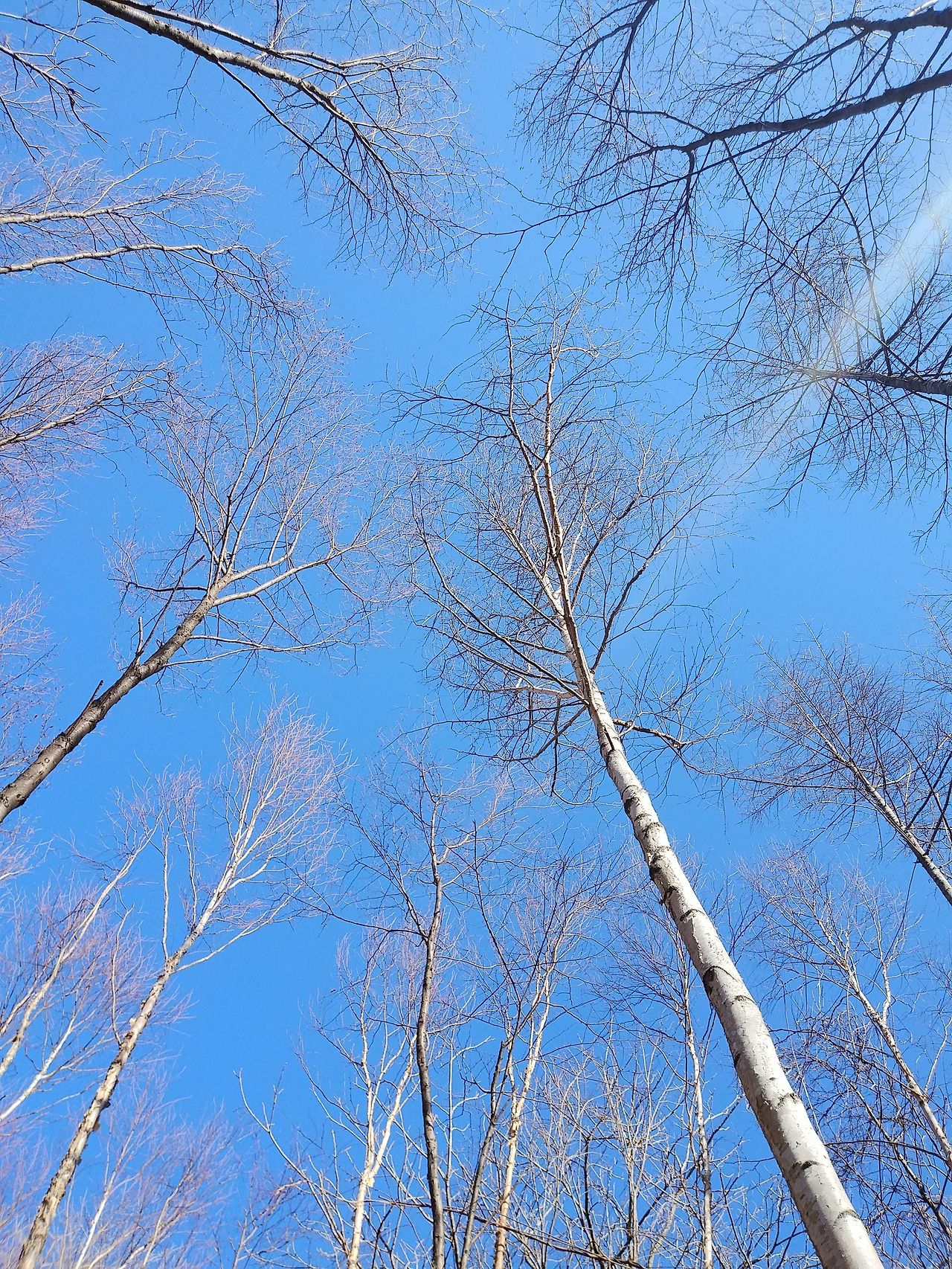 겨울 눈내린 선재길은 더없이 포근하다.<좌> 거제수나무와 파란 하늘 <우>