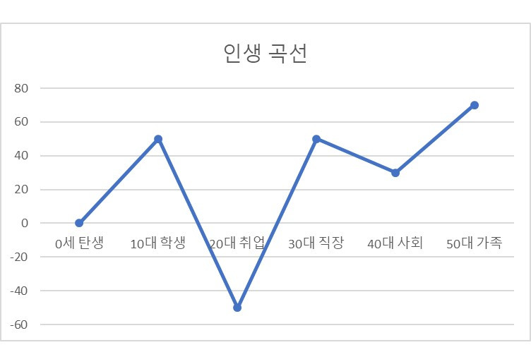 상담 활동에서 상담자가 내담자를 이해하기 위해 활용하는 자료 중 '인생 곡선'이라는 게 있다. 태어날 때부터 현재까지 자신의 인생을 더듬어 좋은 사건이나 성공의 경험들은 + 위치시키고, 나쁜 기억이나 실패의 기억들은 -에 위치시켜 자신의 인생을 경제학에서 사용하는 경기 순환 그래프로 나타낸 것을 인생 곡선이라고 한다.