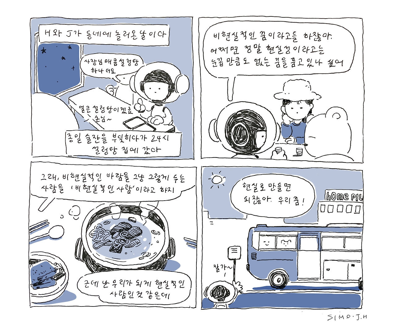 H와 J가 동네에 놀러온 날이다. 오후 3시쯤부터 다음 날 첫차를 기다리면서까지 우리는 쉴 새 없이 이야기를 나눴다. 꿈에 확신이 생겼던 때지만 '비현실성'이라는 벽 앞에서 주춤거리던 때이기도 했다. H는 "비현실적인 꿈이라고들 하잖아, 우리 다 어쩌면 현실성 없는 꿈을 품고 있는건지도 모르고. 그래, 그런 사람들이 있어 비현실적인 바람을 그냥 그렇게 두는 사람들. 그런데 나는 우리가 다르다고 생각해. 너희는 꼭 그걸 현실로 만들 수 있을것 같거든. 현실로 만들면 되잖아 우리 꿈"이라고 말했다. 그거였다. 내가 현실로 만들겠다 결심하고, 그걸 실현하는 순간 그 꿈은 비현실이 아닌 현실이 된다고. 그 순간엔 두 친구들과 함께 내가 아주 현실적인 사람이 됐다. 무지개를 쫒아가는 일조차 신기루가 아니란 것에 희망을 품고 할 수 있는, 지극히 현실적인 일이었다.