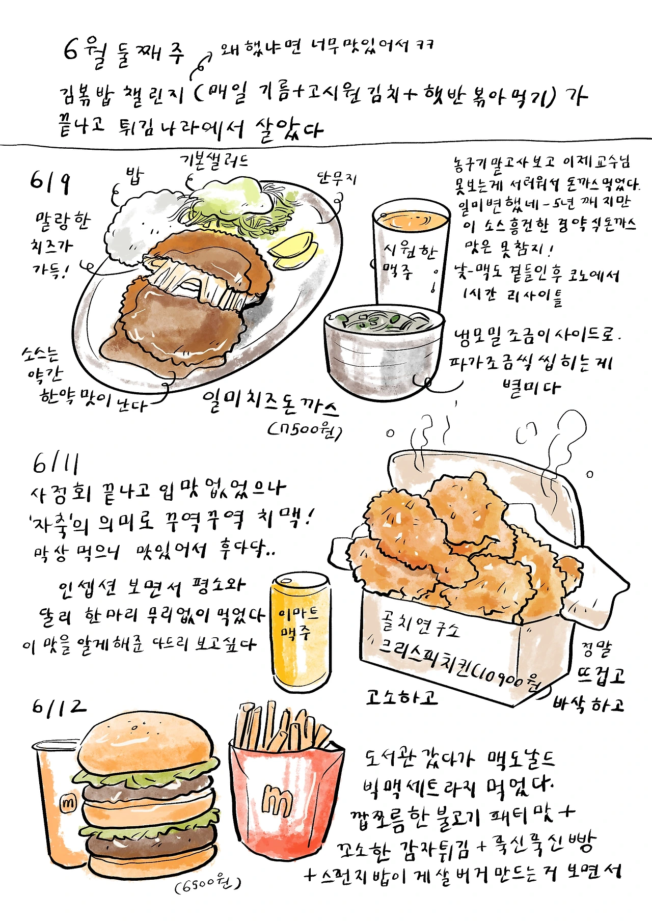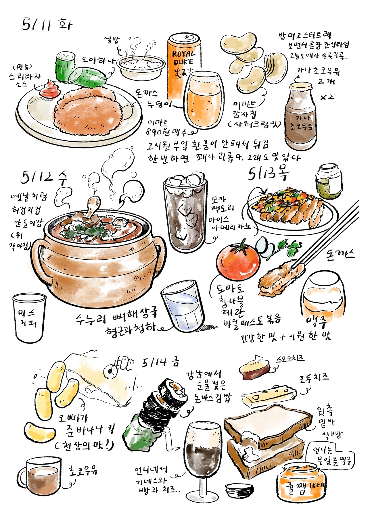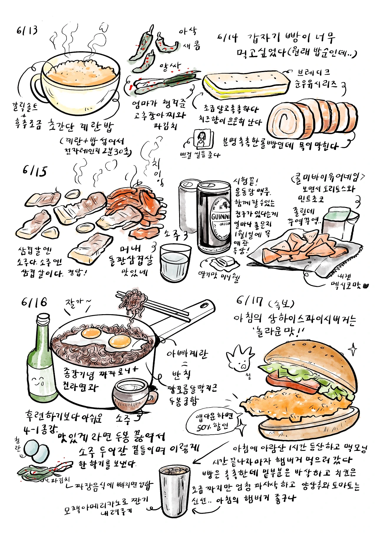 뼈 해장국, 치즈 돈까스, 치킨, 삼겹살, 짜짜로니, 햄버거