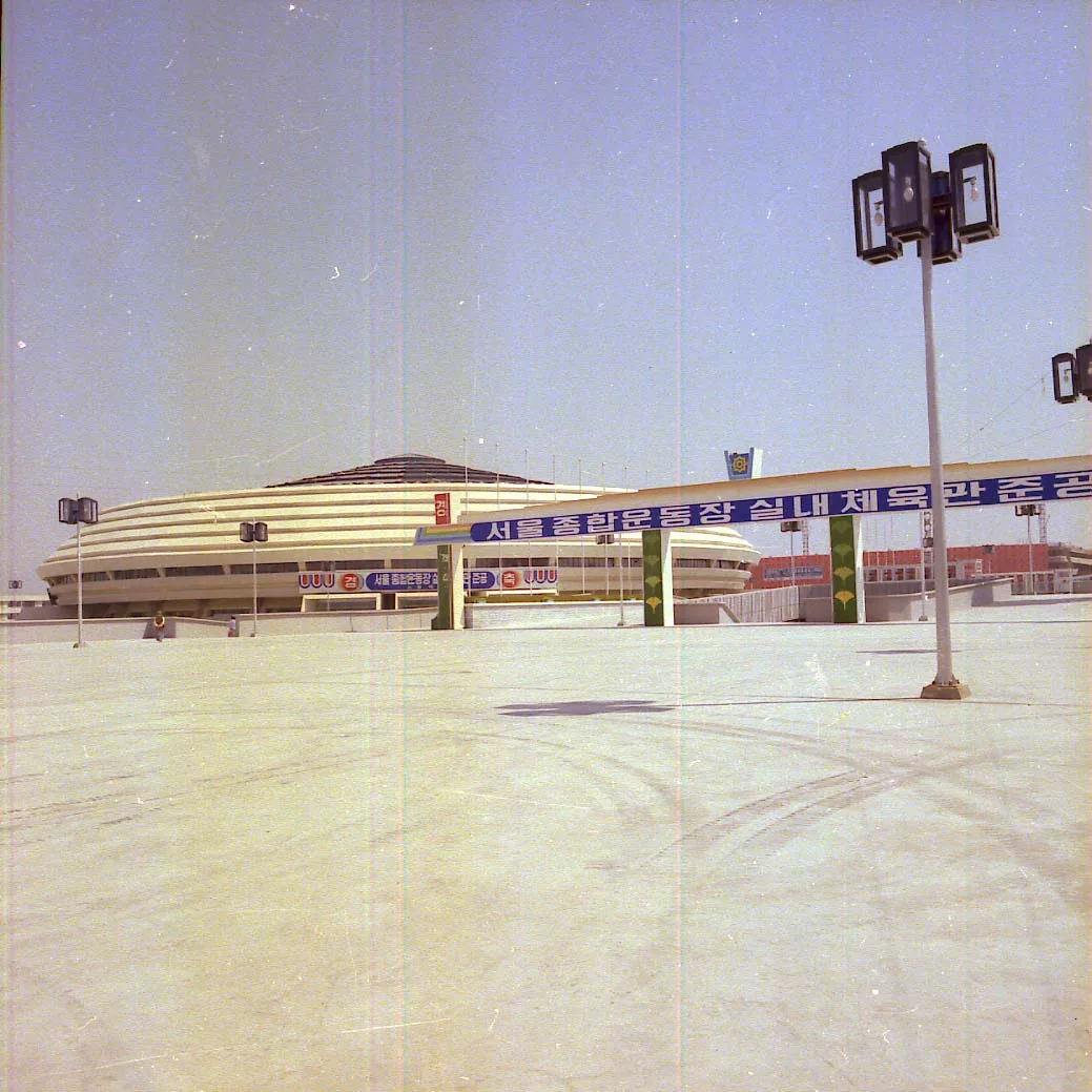 1979년 4월 실내체육관이 준공된다. 잠실 주경기장 일대에서 처음으로 완공된 시설이다. 허허벌판 위에 우주비행선이 착륙한 것만 같은 비현실적인 광경이다. 도로는 새로 닦은 듯 말끔하다. 왼쪽에 보이는 공사장에서는 주경기장이 막 첫 삽을 떴다. 오른쪽의 한강 너머로는 야트막한 들판이 펼쳐진다. 1979년 말에 이르러서야 정부는 올림픽 유치에 도전하기로 한다. 올림픽이 열릴 줄 모르고 지어진 올림픽 경기장이다.