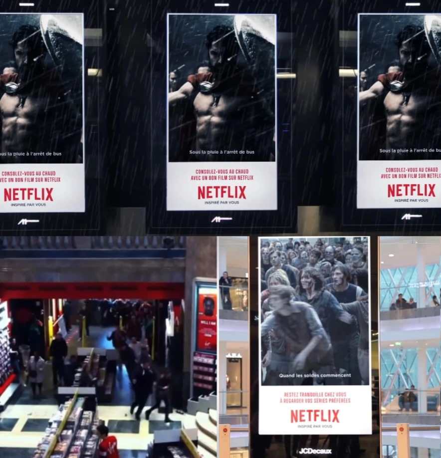 2014년, 넷플릭스는 프랑스에서 런칭했을 당시에도 넷플릭스는 옥외광고를 통한 디지털 캠페인을 펼쳤었다. 영화 속 장면들을 짧은 GIF(짤)로 만들어서 실시간으로 프랑스 상황에 맞는 영상을 틀었다.