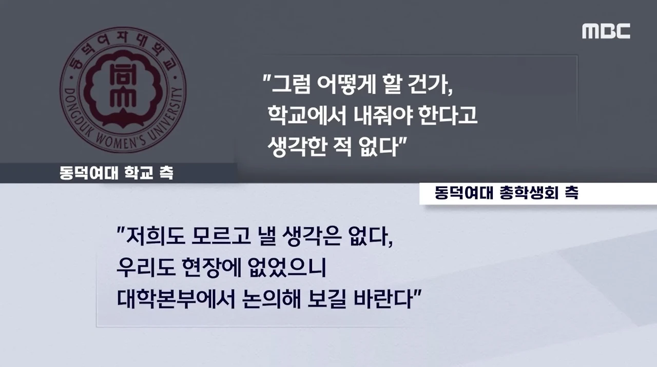 학교 측은 공학 전환은 아직 초기 논의 단계일 뿐이며 학생들의 과격한 시위는 과도하고 폭력적이라고 주장하였다. 그리고 학내 질서 회복과 학생들의 학습권 보호를 위한다는 입장을 밝혔는 데 이러한 시위에 대해서 강경한 대응을 취하고 있다. 학교 기물 파손, 수업방해, 행정업무 마비등을 근거로 54억 원의 피해배상금을 청구하였고 그중 취업박람회 취소분인 3억 3천만 원의 피해액을 학생회 쪽에 전환하였다.