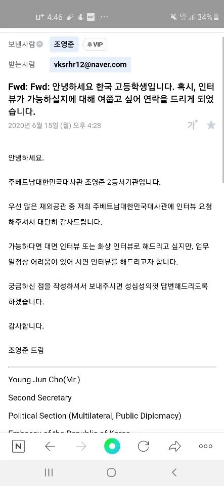 우리는 대사관 등 외교 현장에서 활동하시는 분들의 인터뷰를 통해 현장의 이야기를 접하고 외교적으로 어떤 변화가 일어났는지 알아가고 싶었다. 현재 우리나라와 긴밀한 협력을 맺고 있는 몇몇 국가의 대사관 및 영사관에 이메일을 통해 연락드렸고, 그 중 주 베트남 대한민국 대사관에서 근무하시는 조영준 서기관님과 연락이 닿아 서면 인터뷰를 진행했다.