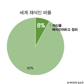 2020년 업데이트된 통계에 따르면, 세계 인구의 8%가 자신이 채식주의자라고 답했습니다. 그중 73%는 채식과 육식을 겸(omnivorous)하고 있고, 14%는 플렉시테리언(flexitarian)입니다. 달걀, 꿀, 유제품 등을 모두 섭취하지 않는 비건은 7800만 명에 달합니다. 인구 중 채식 비율이 가장 높은 나라는 인도입니다. 인구의 20~40%가 채식을 하고 있으며, 종교적 전통으로 인해 채식이 널리 퍼져있습니다.