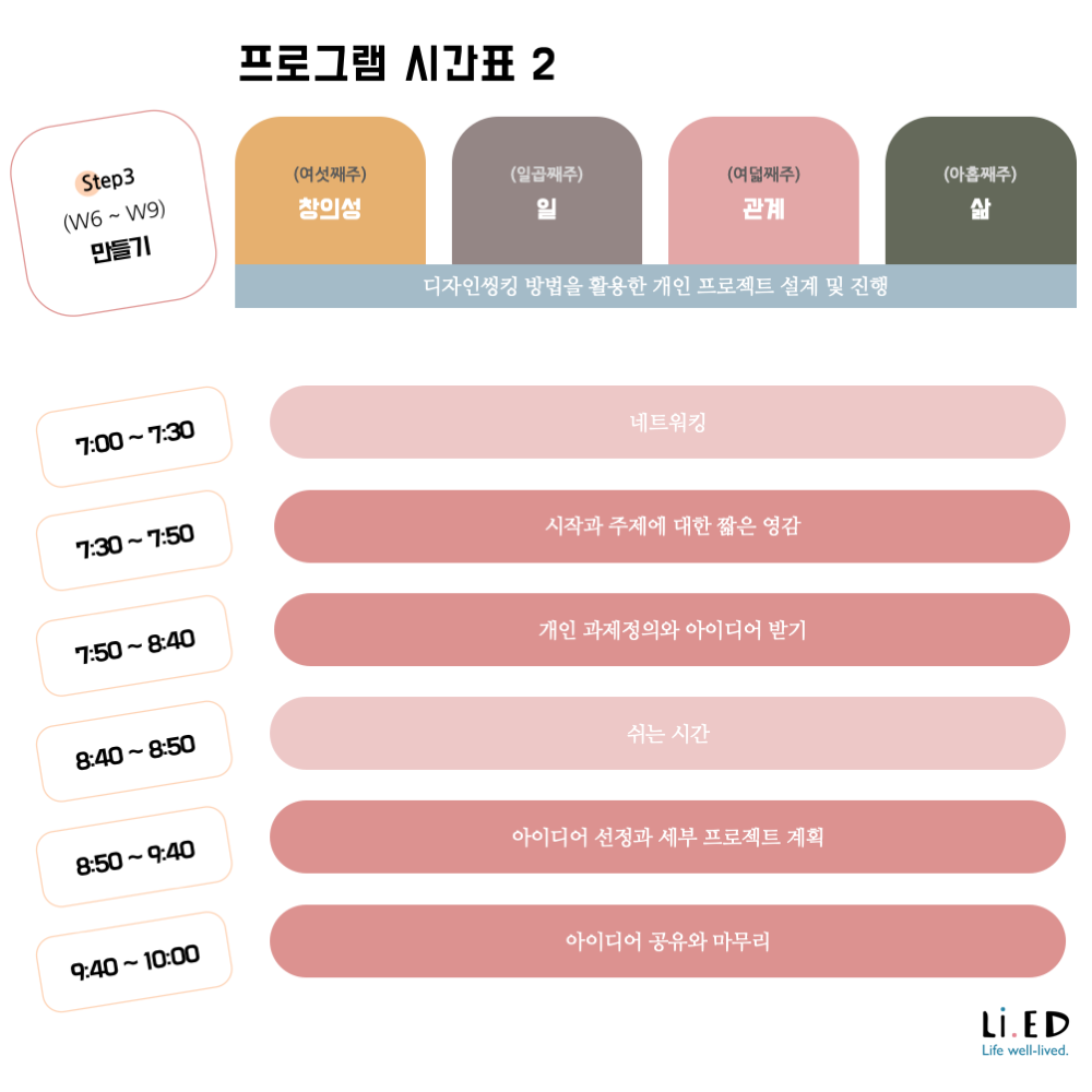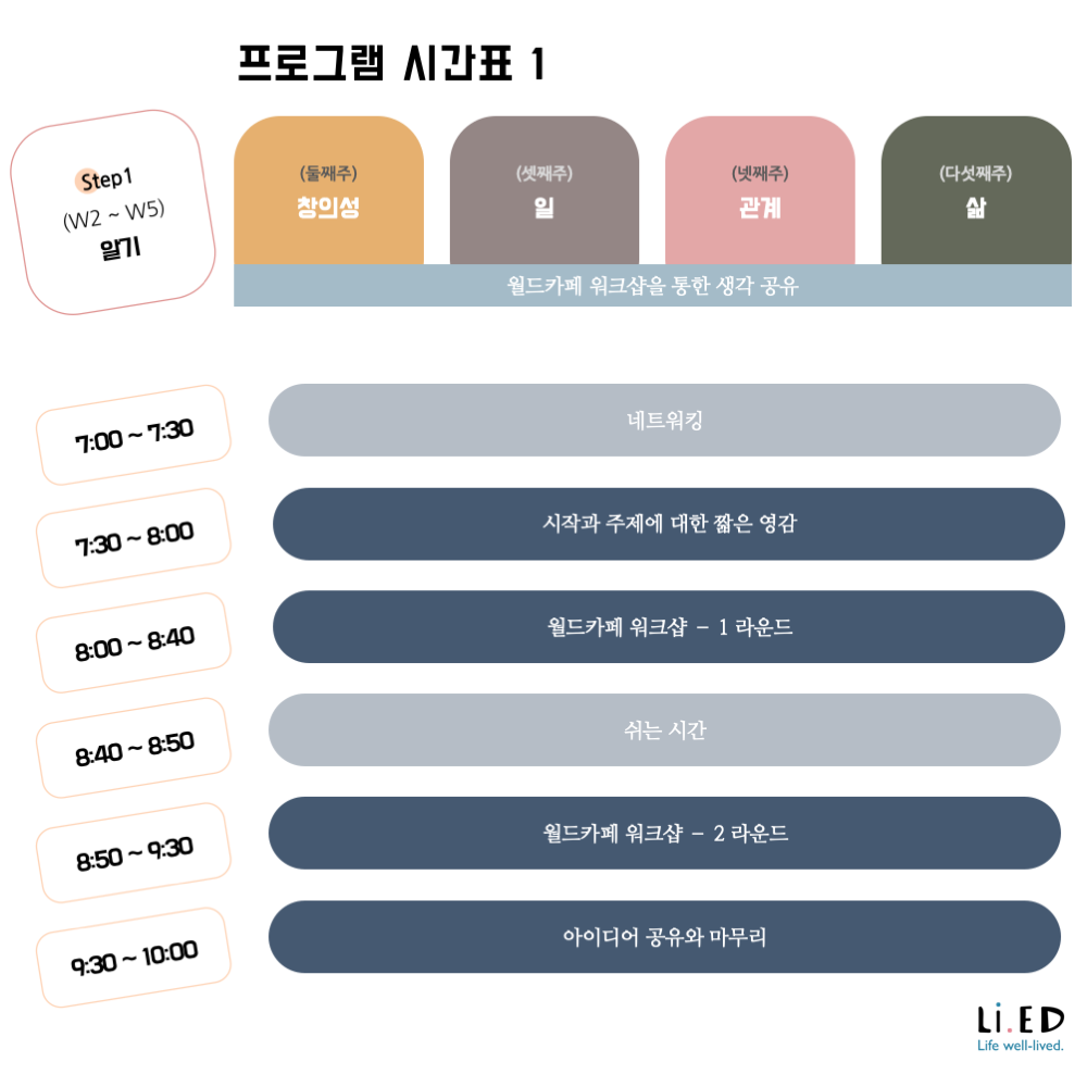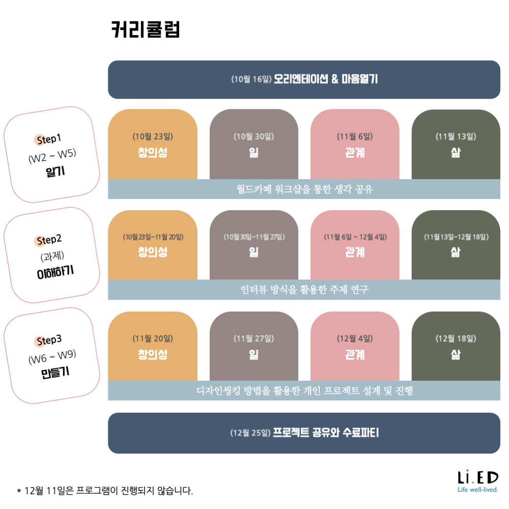 더 재밌게, 멋지게 사는 삶을 위한 토론과 실험 커뮤니티 - Li.ED의 프로그램 커리큘럼이 나왔습니다. 10주간 [창의성], [일], [관계], [삶]의 네가지 주제로 월드카페 워크샵, 인터뷰 방식, 디자인씽킹 방법론을 활용하여 주제 탐구 및 프로젝트 설계 형식으로 진행됩니다.