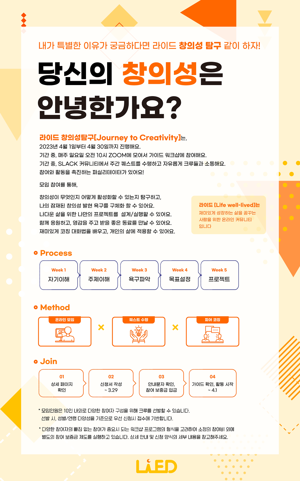 2023년 두 번째 여정의 주제는 "창의성"입니다. 주제 탐구를 통해 나의 관점을 이해하고 자신이 추구하는 가치를 삶 속에서 실현해내고자 하는 누구라도 환영합니다.