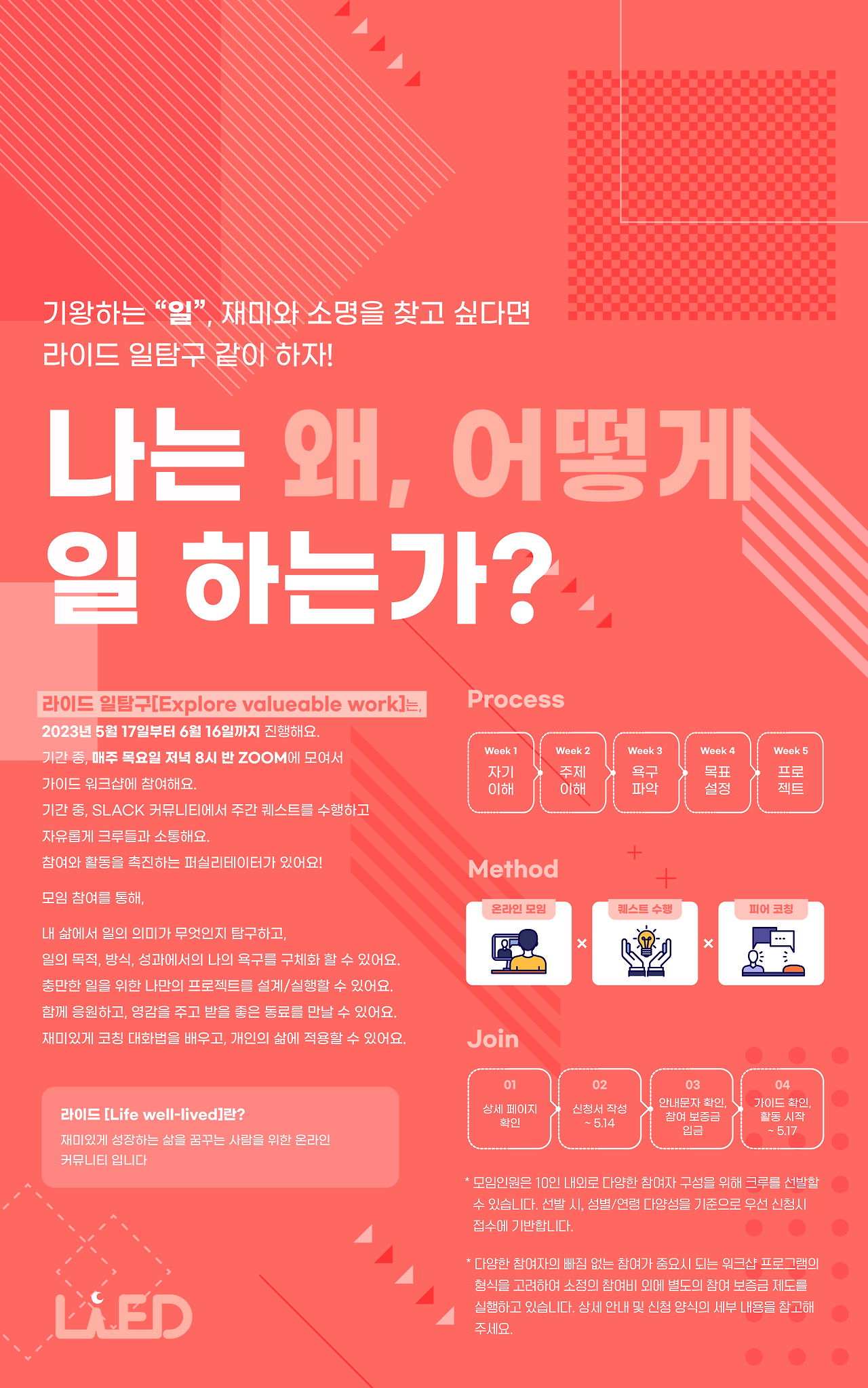 라이드는 더 잘 사는 삶(Life well-lievd)을 위해 개인의 생각과 행동을 바꾸는 작은 경험과 환경을 제공하는 것을 목적으로 합니다. 일상의 주제에 대해 다양한 멤버들이 함께 탐구하고, 공유함으로써 사고를 확장하고, 스스로 실천 과제를 만들어 프로젝트를 진행하는 방식으로 자기 성장의 여정을 함께, 재미있게 진행하고자 해요. 일이라는 주제로 새로운 탐구모임을 함께 할 신입 멤버를 찾고 있어요. 주제 탐구를 통해 나의 관점을 이해하고 자신이 추구하는 가치를 삶 속에서 실현해내고자 하는 누구라도 환영합니다.