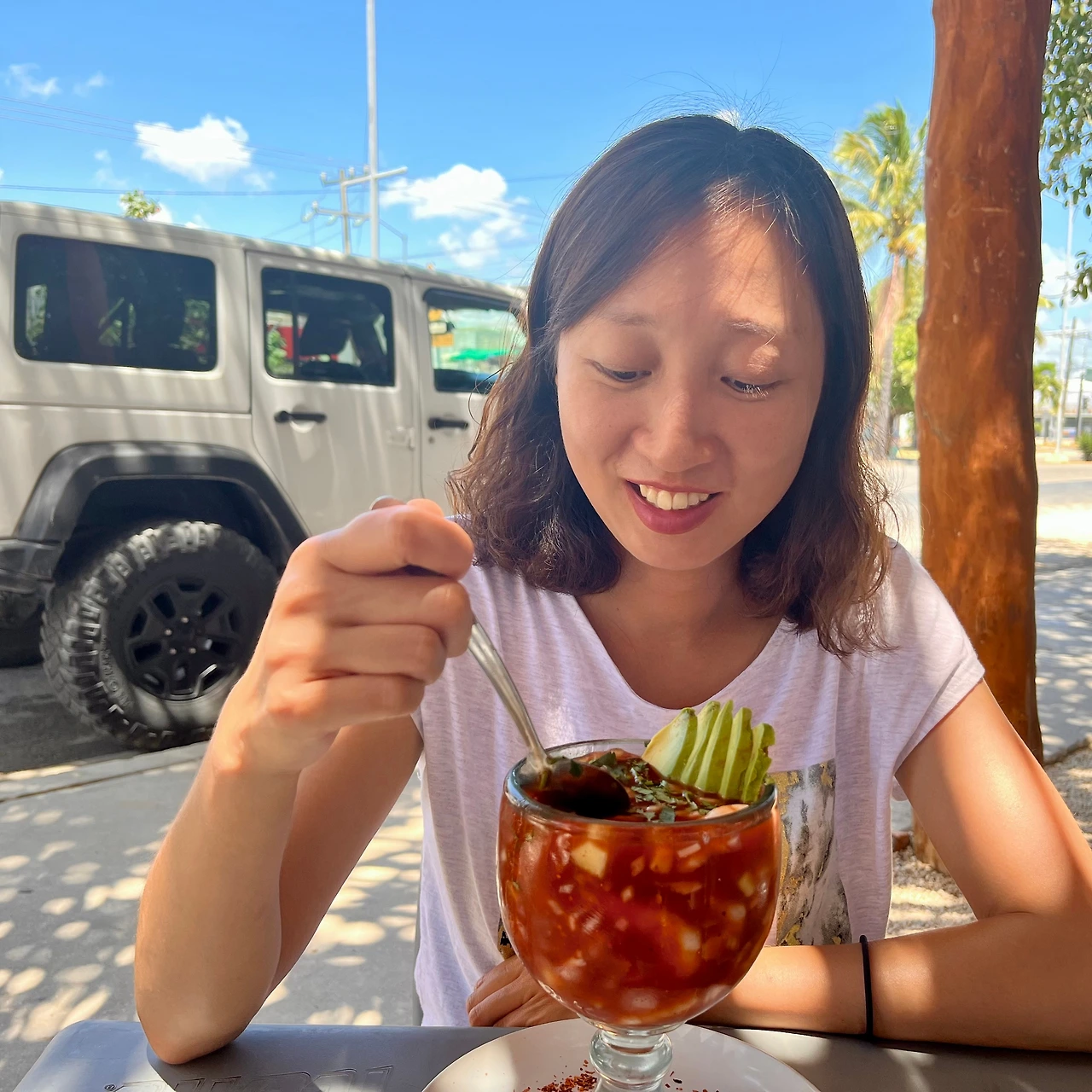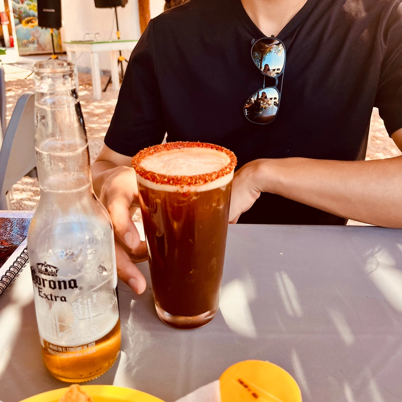 그리하여 멕시코에서 보낸 보름은 현지에 대해 배움이 적은, 멋 모르고 지내는 시간같았다고 말하겠다. 멋진 세노테와 캐리비안 바다, 놀거리, 먹거리가 있었고, 그럼에도 멕시코의 다른 지역과 달리 안전하다고 소문난 보낸 칸쿤 지역에서의 보름은 솔직히 나쁘진 않았지만 큰 매력을 느끼지 못한 채 끝났다. 혹은 지불한 비용에 비하면 만족도가 떨어졌다고도 하겠다. 멕시코가 식문화가 발달한 곳임을 감안하면 약간은 아쉬운 기분도 들었다. 그래서 짧은 경험을 바탕으로 멕시코의 식문화를 설명하기 위한 시도를 해 보자면 “실험"과 “자극" 정도로 키워드를 붙일 수 있겠다. 맹맹하거나 짠, 이라는 두 개의 맛으로 대변되던 쿠바의 음식과는 달리 멕시코의 모든 음식에는 다양한 맛, 특히 매운맛이 찐하게 가미되어 있었다. 어느 정도냐면 맥주를 칠리 플레이크와 함께 먹을 정도? 마가리타에 라임즙을 발라 소금이나 설탕으로 가니쉬를 해 먹거나, 테킬라를 소금과 함께 먹는 것은 비교적 익숙해 거부감이 없었는데 그 가니시를 고춧가루로 한 맥주 칵테일 미첼라다는 내게 참신을 넘어 동공이 커지는 경험을 하게 하는 맛이었다. 그 술을 멕시코에서는 꽤 대중적인 해장술로 마시고 있었고 그 버전 또한 다양하고 기발해 가게마다 이름만으로는 맛을 예측할 수 없을 만한 다양한 미첼라다를 팔고 있다. 또 하나 흥미로운 먹거리는 칵텔 데 카마로네스라고 불리는 새우 칵테일이었는데 칵테일 잔에 담긴 걸쭉한 토마토 주스와 자숙새우의 조합으로 보이는 그 메뉴는 전혀 호감이 가지 않는 비주얼을 가지고 있다. 가는 식당마다 사람들이 먹는 걸 보니 비주얼에도 불구하고 호기심이 들어 시켜 먹어 보니 상상 외로 새콤하고 쫄깃한 것이 사람들이 찾는 매력이 무엇인지 알 것 같았다. 그 외에도 달고, 자극적이고, 큰 디저트류도 혀를 내두르게 했는데, 멕시코 사람들이 창의성을 발휘하는 분야가 바로 음식이란 생각을 하게 되었다.