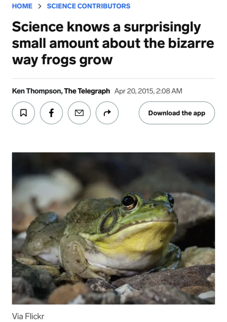 성장과정을 세분화한 부분이 인상적이었지만, 앞다리가 하나씩 나온다는 부분은 놀라움에 더해 의문을 불러일으켰다. 남편과 ‘정말? 과연? 진짜야?’와 같은 수많은 물음표를 나누었다. 궁금해하면서도 찾아볼 생각은 하지 않았다. 며칠 전 남편이 메시지로 링크를 하나 보내왔다. ‘The Telegraph’라는 잡지에 실린 기사였다. 제목은 “과학은 개구리가 얼마나 특이한 방식으로 성장하는지 놀라울 정도로 잘 모른다 Science Knows a surprisingly small amount about the bizarre way frogs grow”였다. 제목부터 라윤이의 글과 같은 논조였다. 기사에는 글래스고 대학과 에든버러 대학의 과학자들이 진행한 올챙이의 뒷다리와 수영 실력에 관한 연구가 소개되어 있었다. 그리고 바로 거기에, 나와 남편이 품었던 의문에 대한 답이 있었다.
