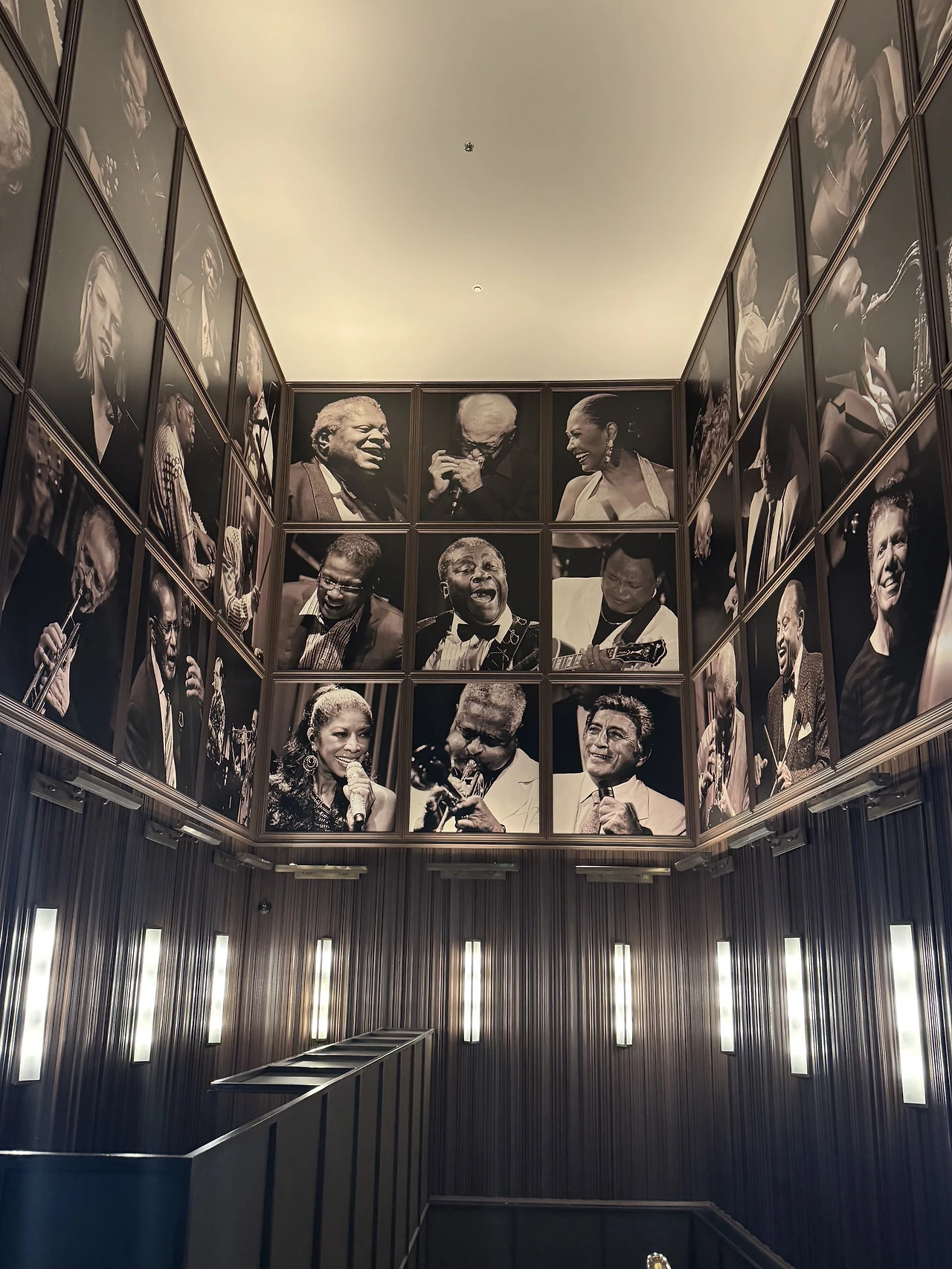 공연 시간이 되어 블루노트 도쿄에 도착했을 때, 입장하는 사람들 대부분이 건물을 배경으로 기념사진을 찍고 있는 모습이 눈에 띄었다. 블루노트 도쿄의 외관은 예상보다 아담했지만, 길게 솟은 직사각형 형태의 목재 건물에 파란 조명이 띠처럼 둘러져 있어 단정하면서도 고급스러운 인상을 주었다. 입구로 들어서자마자, 벽면을 가득 채운 재즈 아티스트들의 사진이 눈에 들어왔다. 마치 한 공간 안에 재즈의 역사가 겹겹이 축적되어 있는 듯한 느낌이었다.