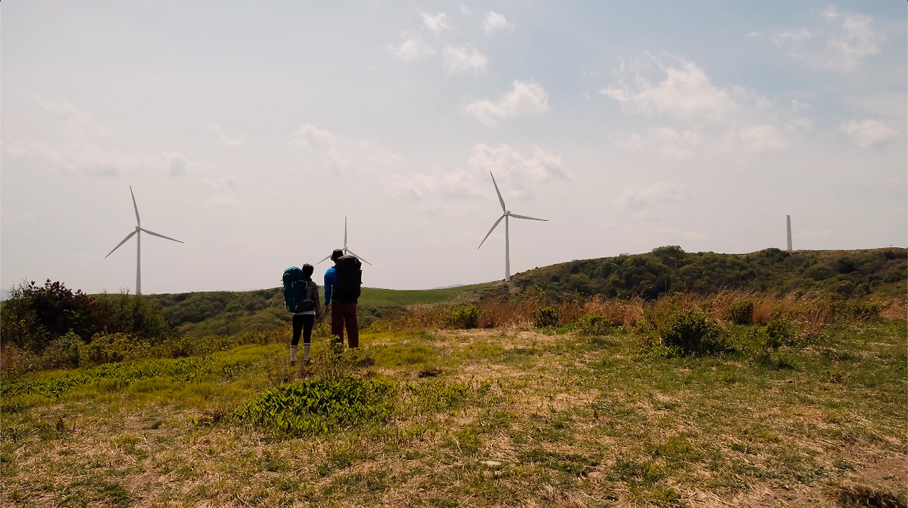 군데군데 귀여운 진달래와 야생화가 피어있었다. 꽃에 눈이 팔려 알아차리지 못한 사이 어느새 선자령 능선의 풍경이 보였다. 가로로 드넓게 펼쳐진 정적인 풀밭과 대조적으로 거대한 풍력발전기는 저 홀로 움직임을 갖고 있었다. 조용한 초지의 모습과 달리 거대한 소리를 울리며 돌아가는 풍력발전기가 어울리지 않을 듯하면서도 이색적인 풍경을 이루고 있었다.