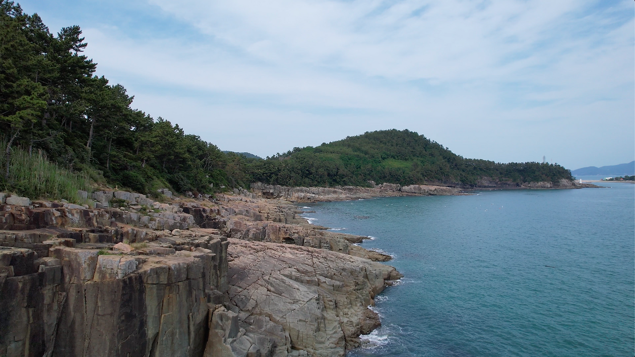 숲과 바위섬을 보면서 붐비는 인파에 피곤해졌던 체력이 돌아오는 걸 느꼈다. 자연은 그런 힘을 갖고 있다. 낭도의 트레킹 코스는 숲과, 바위와, 바다를 만나는 길이었다. 암벽을 타고 내려가면 공룡발자국이 있다는 천선대 바위 해안이 나타난다. 누군가 일부러 조각해 놓은 듯 층을 이루며 부서진 바위가 개성 있는 풍경을 이루고 있었다.