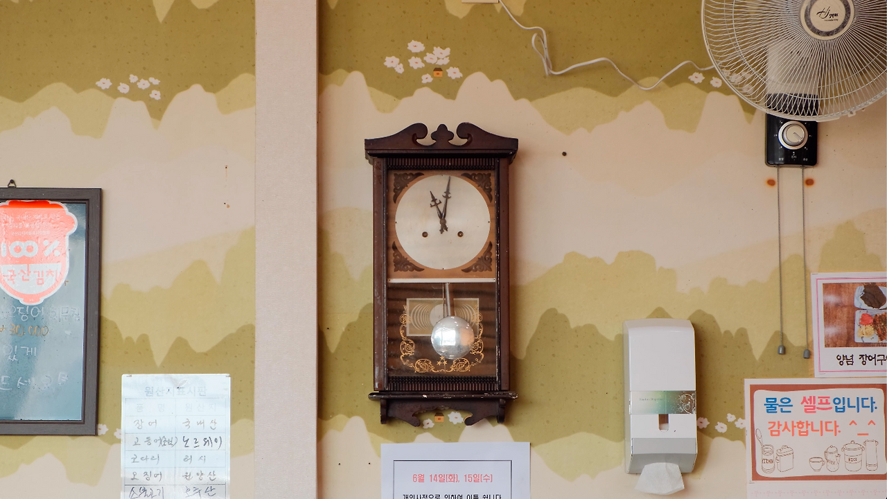 우리는 3박 4일 여수 섬 여행의 마지막 종착지, 낭도로 향한다. 낭도는 차로 들어갈 수 있는 섬이라 금오도에서 백야도항으로 이동 후 버스를 타고 낭도로 들어갈 계획이었다. 출출했던 우리는 백야도항 주변 식당에서 일단 밥부터 먹어야 했다. 여행이 3일째가 되니 챙겨 온 음식도 바닥이 났다. 가방에 하나 남아 있던 양갱을 둘이서 나눠 먹고 근처 백반집으로 들어갔다. 수십 년 된 괘종시계가 벽에 걸려 있는 오래된 식당이었다. 무심히 내어주시는 나물 반찬이 맛 좋은 곳이었다.