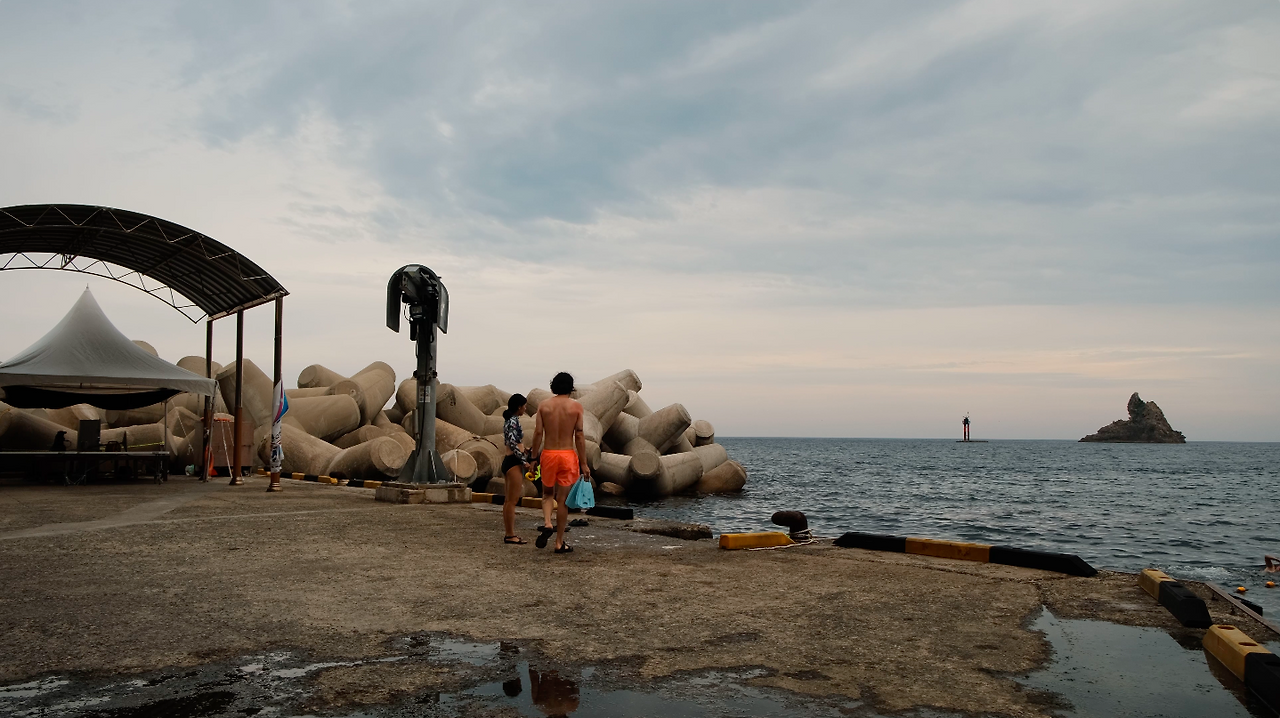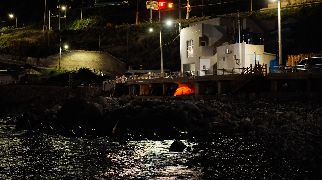 우리는 서둘렀다. 내수전으로 가서 어서 빨리 바다에 들어가고 싶었기 때문이다. 벌써 해가 지고 있었다. 우리는 택시를 타고 내수전으로 이동했다. 도착하자마자 허겁지겁 텐트를 피칭하고 수영복으로 갈아입었다. 내수전의 바다는 이끼 낀 바위가 많이 보였다. 그 사이로 물고기들이 헤엄을 치고 있었다. 나는 햇빛 알레르기 때문인지 갑자기 머리가 아파 금방 물놀이를 그만두어야 했다. 그도 금세 해가 져서 내수전에서의 물놀이는 아쉽지만 짧게 끝내게 되었다.