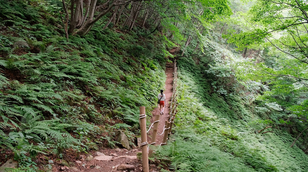 우려했던 것과 달리 등산로는 그다지 험하지 않았다. 우리는 우거진 수풀 사이로 난 길을 따라 걸었다. 나중에 성인봉에 올라 정상석을 보고서야 알게 된 사실이지만 성인봉은 984m의 해발고도가 꽤 되는 높은 산이었다. 등산길이 어렵고 험하진 않았지만 봉래폭포에서 시작하여 둘러가게 된 데다, 길이 꺾어지며 길게 이어져서 생각보다 많은 걸음이 들었다.