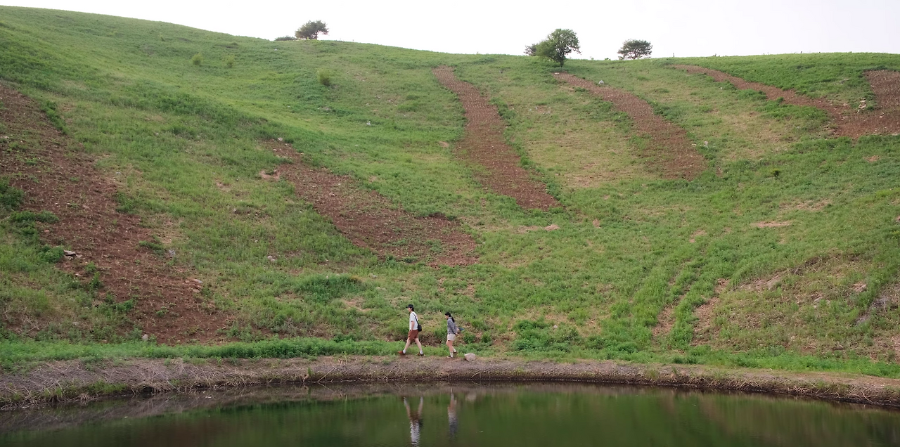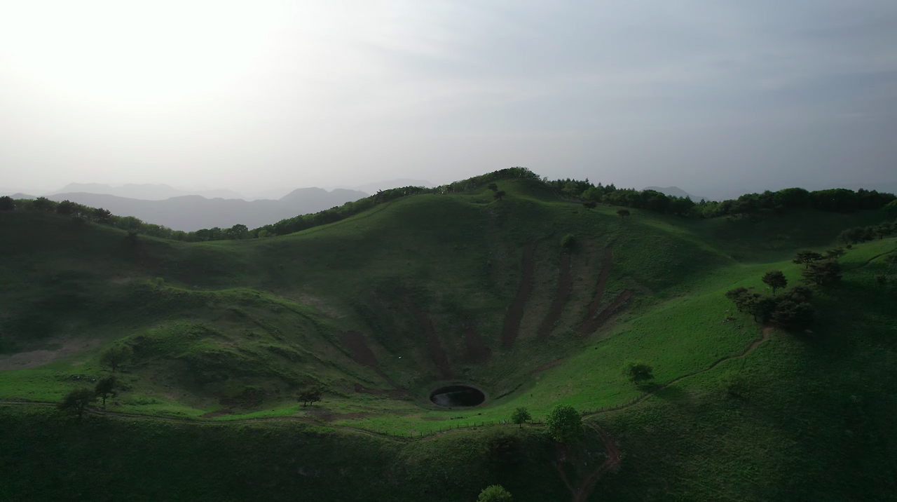 아직 시간이 다소 이른 감이 있어 짐을 내려두고 주변을 둘러보기로 했다. 산 위에 펼쳐진 풀밭이 보기에 좋더라. 소박하게 둘러쳐진 울타리 길을 따라 우리는 천천히 걸었다. 걷다 보니 움푹 파인 독특한 장소를 만났다.