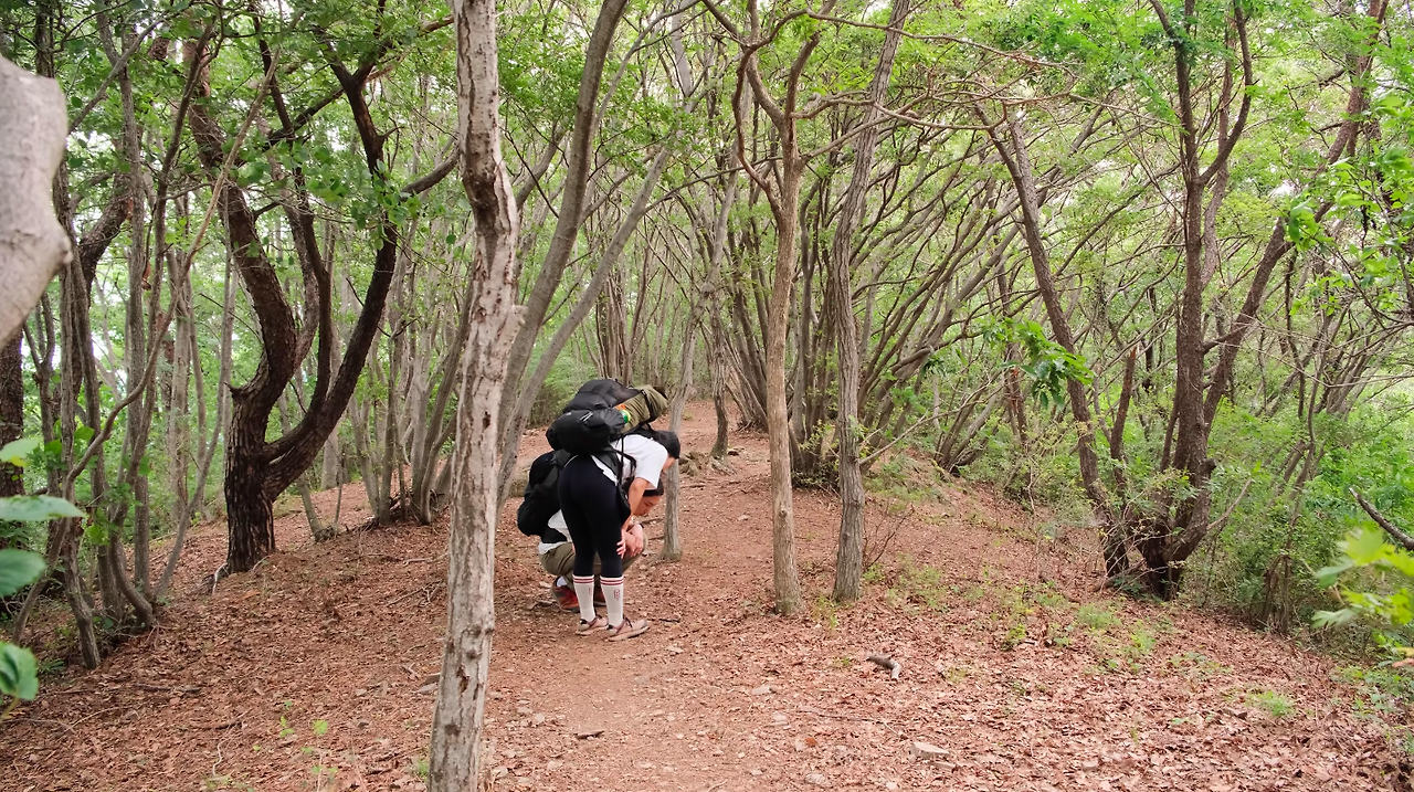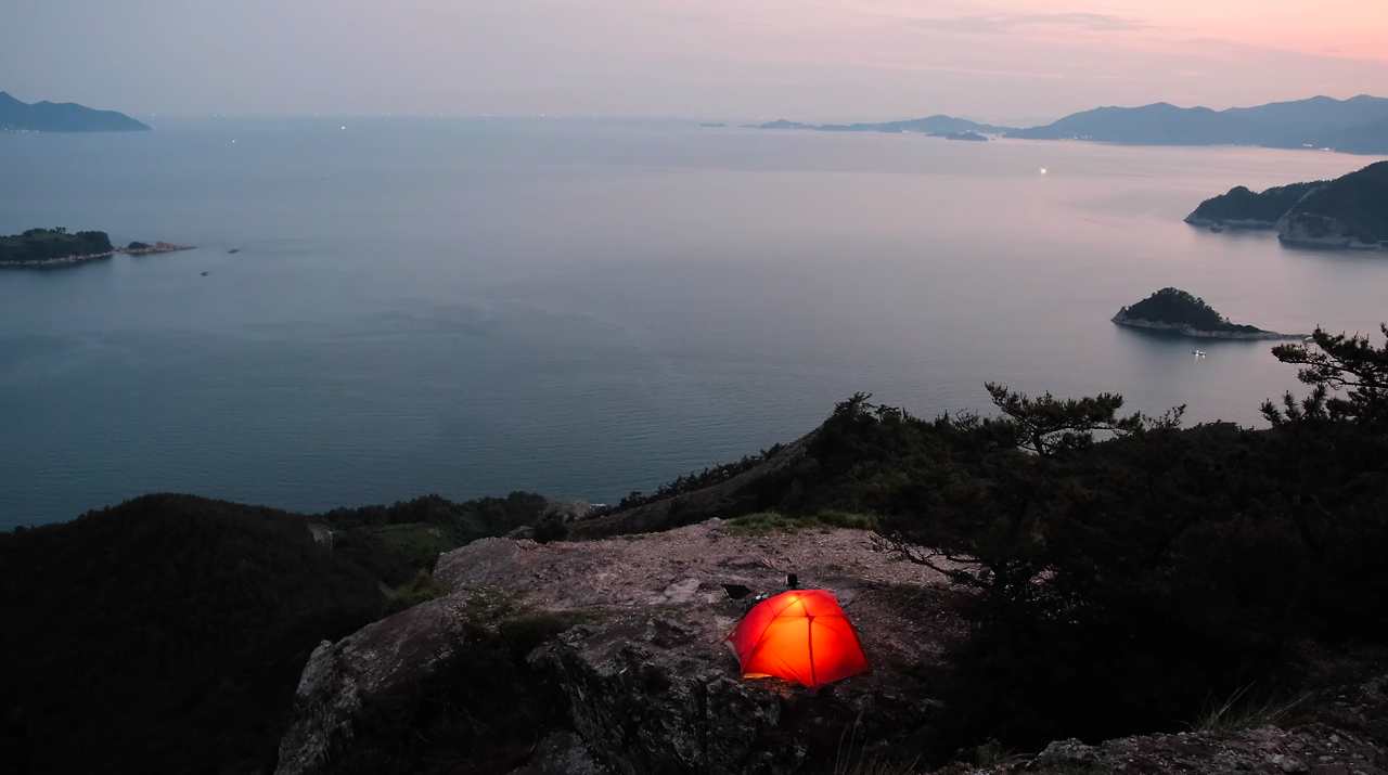 등산을 하는 동안 우리의 계획은 계속해서 수정되었다. 사량도 종주는 예상보다 시간이 많이 걸리는 길이었고, 아마도 산중에서 하룻밤을 보내야 할 것 같았다. 우리는 미리 끊어두었던 내일 배표를 취소했고, 내일 아침엔 몇 시에 일어나야 할지를 다시 역산해 보았다. 그렇게 산을 기웃기웃하며 오르다가 하룻밤을 보내기 좋은 장소를 발견하였다. 사량도 종주 코스의 첫 산봉우리인 지리산도 미처 다 오르지 못한 상태였다. 하지만 시간은 벌써 해 질 녘이 되어 갔다. 우리는 이곳에서 하룻밤을 보내고 내일 아침 일찍 일어나 산을 종주하기로 했다. 백패킹은 신기하게도 잠잘 곳이 정해지면 다른 모든 것이 정리되는 여행이다. 우리는 텐트 칠 자리를 잡고서야 비로소 마음을 놓았다.
