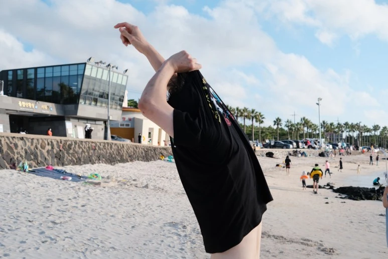수영복으로 갈아입고 가벼운 몇 가지의 물건만 챙겨 털레 털레 해변으로 나갔다. 수영복을 입고 밖에서 걷는 게 조금 이상한 기분이 들었다. 갑자기 헐벗은 기분. 그래서 나는 반바지와 티셔츠를 수영복 위에 걸쳤다. 그는 바로 앞이니 그럴 필요 없다고 했지만 내가 시키는 대로 티셔츠를 입어주었다. 몇 걸음 나가자 벌써 비키니 수영복을 입은 사람이 우리 앞으로 지나갔다. 내 눈에도 그들이 아무렇지 않아 보였다. '거봐 그냥 나와도 아무렇지 않잖아'라고 그가 말했다.