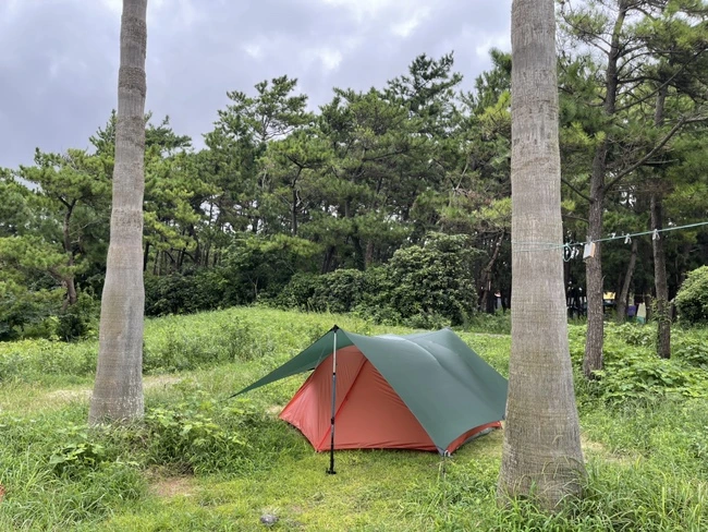 그가 깨지 않도록 조용히 움직여 텐트 지퍼를 열어 보았다. 텐트 앞에는 키가 큰 야자수들이 줄지어 서서 '여기가 제주요' 외치고 있었다. 비가 올 수도 있다는 예보에 지난밤 어두운 중에 헤드랜턴을 끼고 둘이서 어설프게 타프까지 쳤는데 비는 오지 않았다. 텐트 안에서는 수많은 소리가 들린다. 바람에 텐트에 모래인지 나뭇잎인지가 부딪히면서 계속 빗소리 같은 토독 토독 하는 소리를 냈다. 우리는 청각이 있는 대로 없는 대로 예민해져서 새벽부터 밤잠을 설쳤더랬다. 그만큼 우중 캠핑을 고대하고 있었는데 비는 오지 않았다. 우중 캠핑이 얼마나 고생 인지도 모르는 우리는 그저 아쉬웠다.
